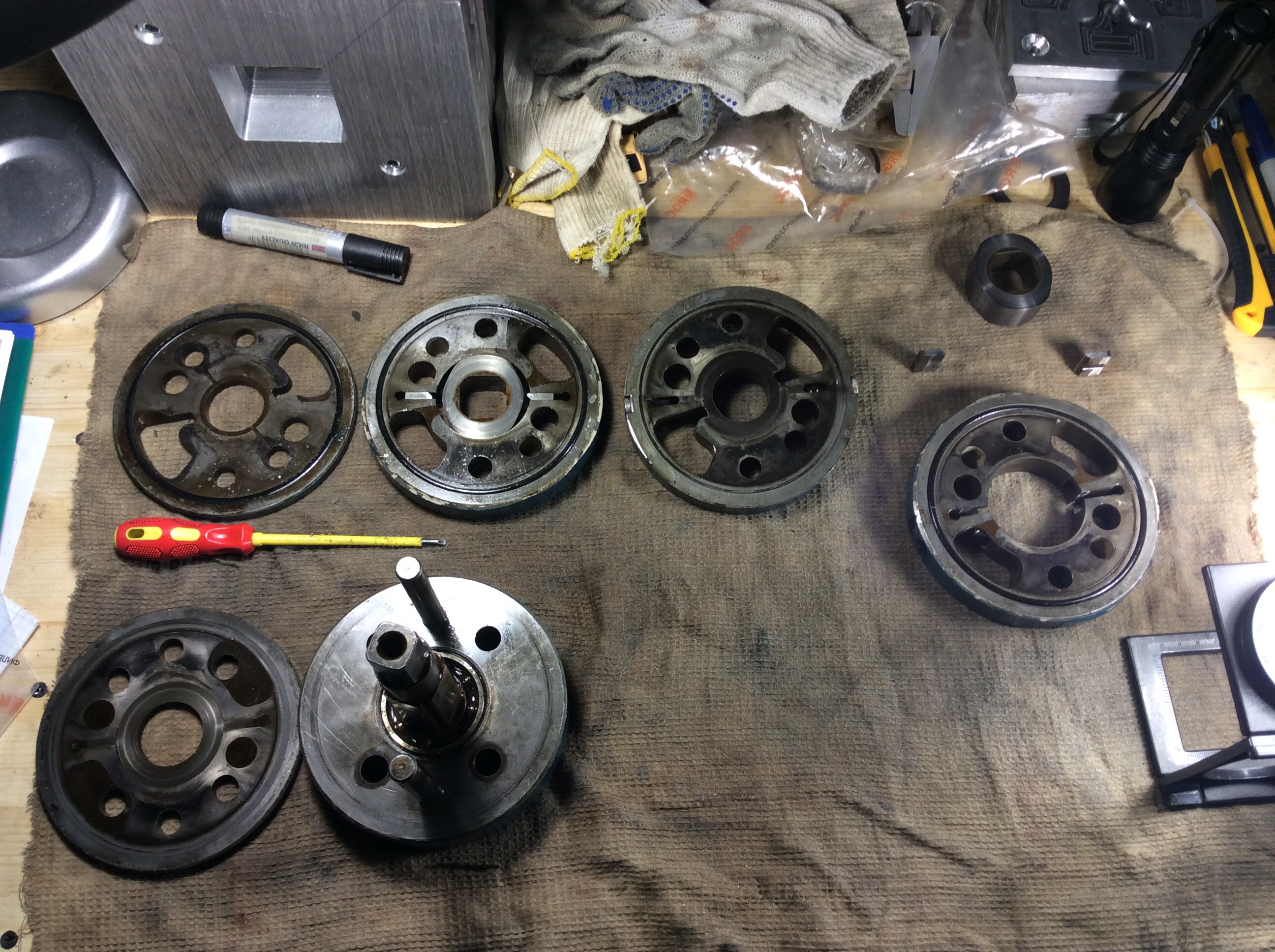 Сначала фото разобранного насоса. Может кому понадобится. Детали расположены по порядку их снятия "как пишем" (слева направо, сверху вниз).