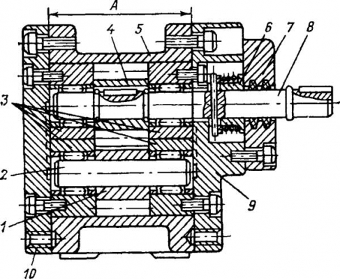 На потерю производительности, развиваемой шестеренчатым насосом, приводит увеличение торцовых зазоров между шестернями 1 и 4 и опорными втулками 3. Утечки через торцевые зазоры больше, чем через радиальные зазоры при равном значении этих зазоров, так как при вращении шестерен создается сопротивление течению масла по радиальным зазорам между выступами зубьев и расточенным отверстием в корпусе.