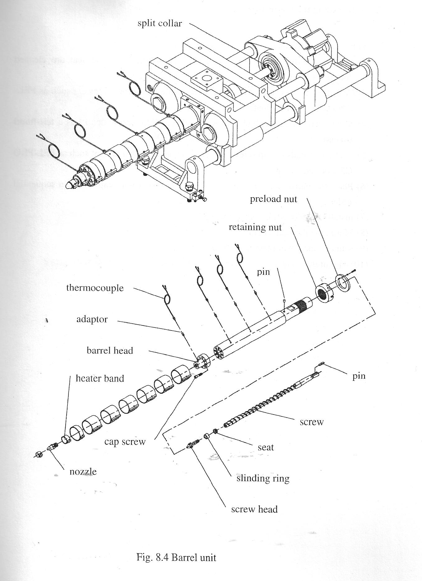 Узел впрыска и пластикации вверху и мат.цилиндр и шнек после препарации.Так до нуля разбирать не придется, весь интерес взглянуть только на шнек. Опишу мой метот изымания шнека.