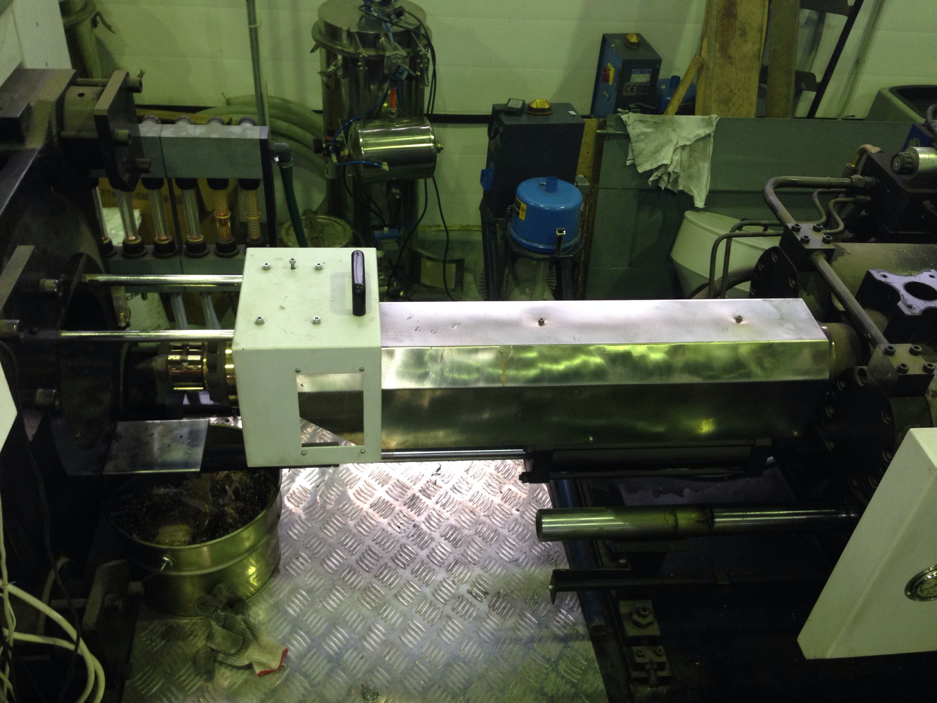 2. Снимаю лит.форму, при этом даю машине максимальное раскрытие. Заодно ставлю высоту прессформы так же по максиму, тем самым увеличивая свободное пространство между окончанием мат. цилиндра и подвижной плитой. Для чего? Шнек довольно длинный, чтобы его выбрать из цилиндра нужно свободное пространство превышающее его длину.