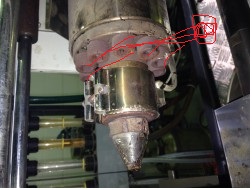 6. Засыпаю в горловину немного ПС стекла, делаю набор и впрыском выдавливаю "barrel head". Если материал вытекает из сопла и этот фланец не выдавливает, то тогда выгоняю остатки стекла, выключаю обогрев сопла и жду пока оно остынет. Термопару и нагревательный элимент с сопла лучше снять. Их можно при падении наконечника повредить. Остыло, засыпаю снова стекло, делаю набор и выдавливаю наконечник.