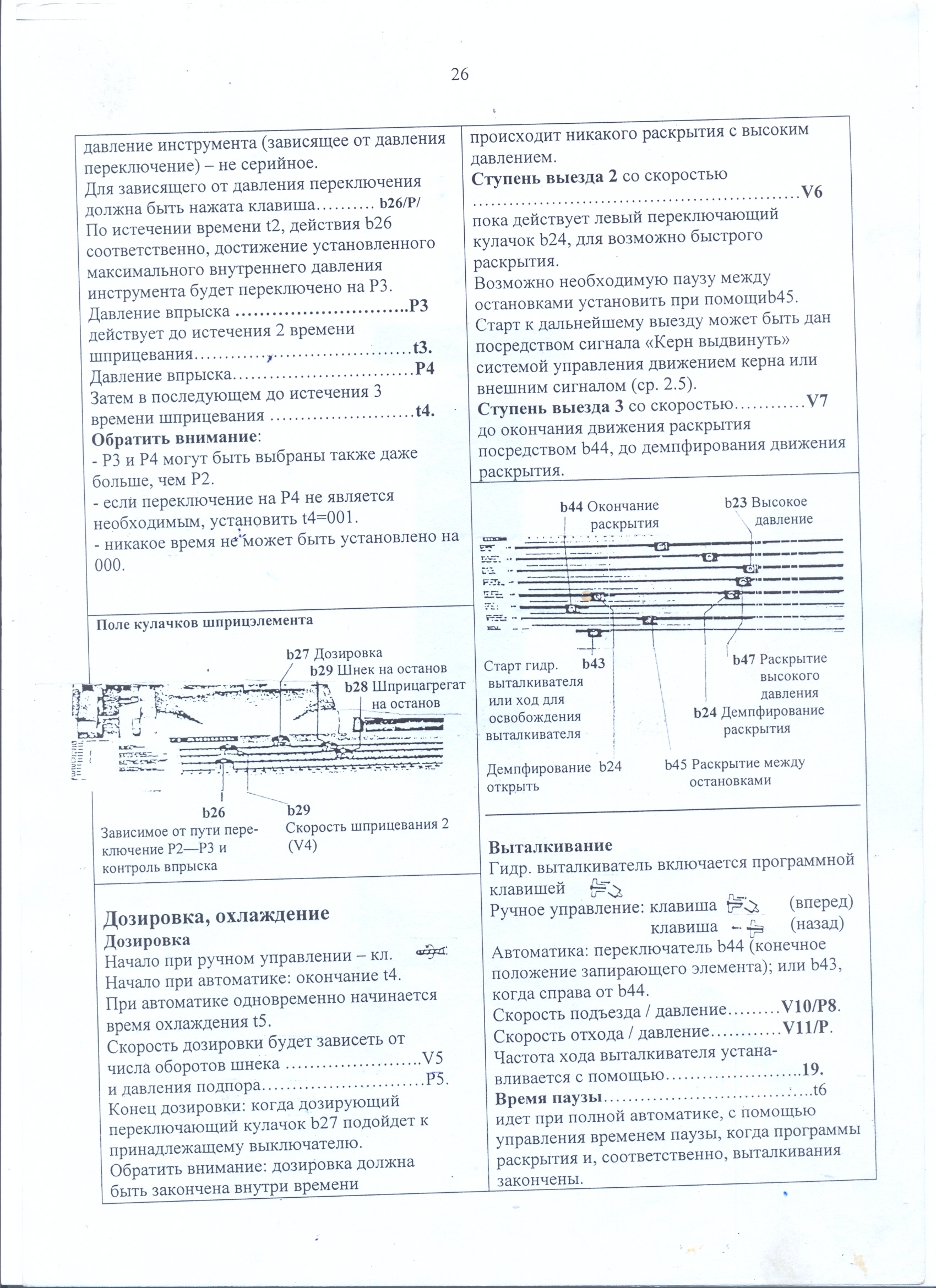 В описании указано что на всем пути действует одно давление P1 устанавливаемое при помощи пропорционального клапана S51. Скорости есть только 2 ступени (задается при помощи S50). V1 - скорость от b44 до b46, скорость V2 от b46 до b23.Мулланур писал(а):s 74- включает давление предохранения формы, а остальное только вредположение или он работает, или после того как разомкнется b24 скорость и давление увеличивается с помощью s50 и s51 и изменения производительности насоса.