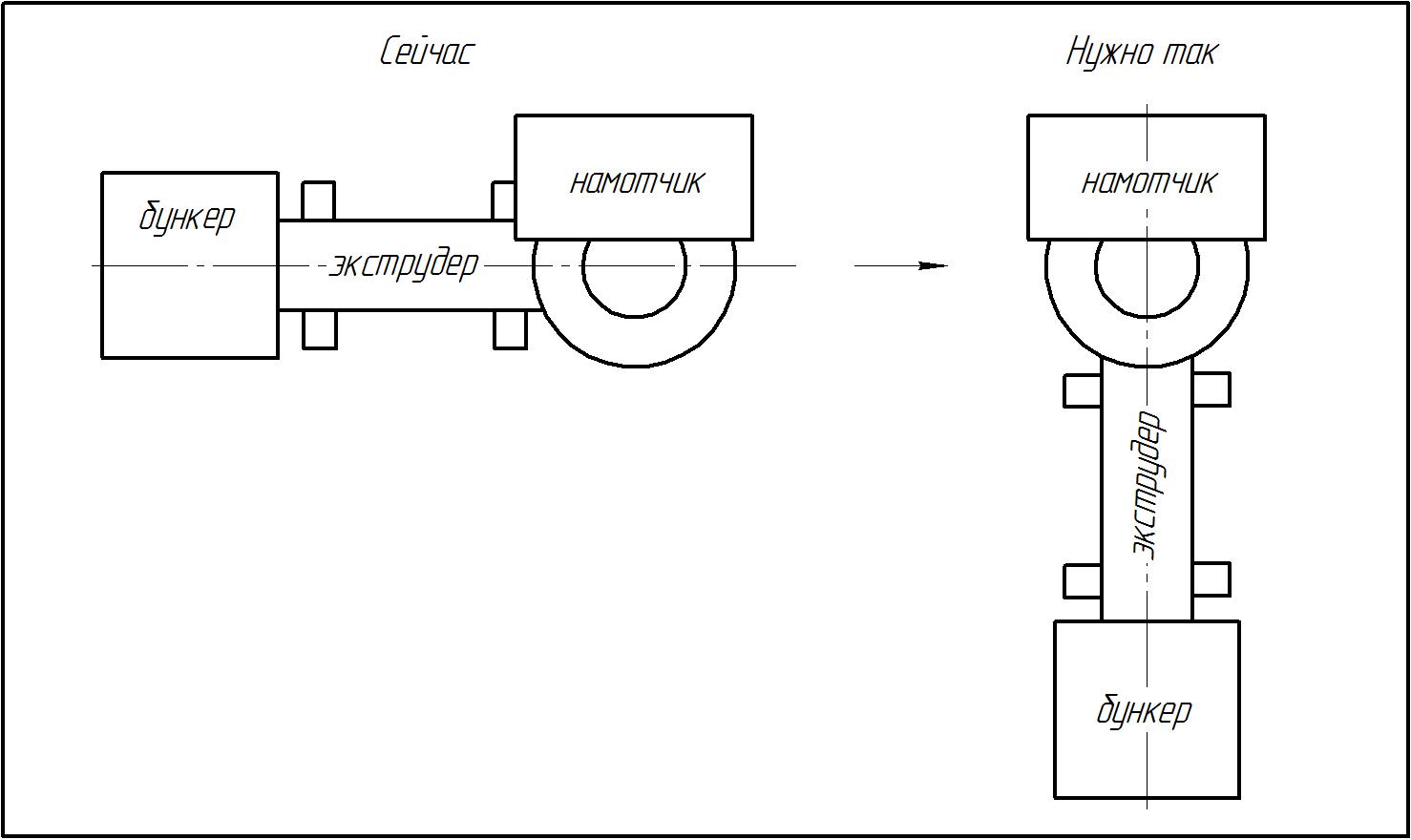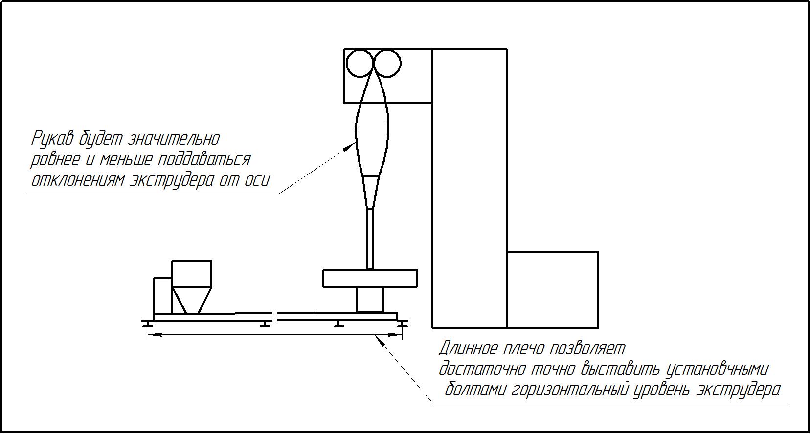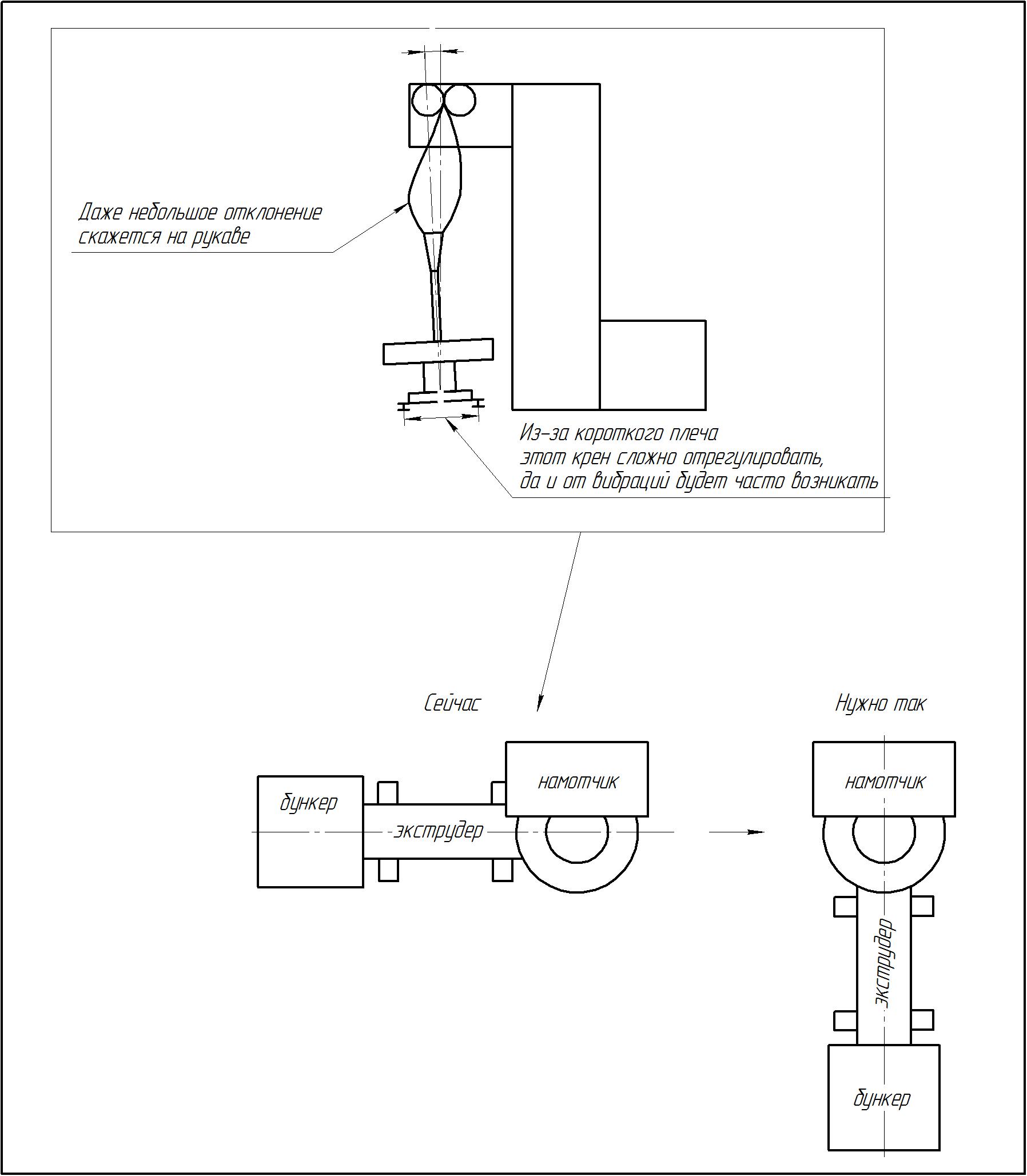 Расположение экструдера вдоль линии намотки плёнки является наиболее предпочтительным, т.к. выставить и отрегулировать экструдер по длинному плечу (и самому ответственному по разнотолщинности) намного проще. Тогда как отклонения вправо-влево грозят нам лишь тем, что полотно будет немного отклонено в одну из сторон по намотке, что решается смещением шпули. У Вас же сейчас наоборот - отклонения вправо-влево экструдера, очень чувствительно отзываются на разнотолщинности и отклонении рукава. А чтобы экструдер отклонился нужно немного (причина всему вибрация).