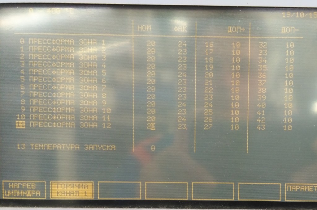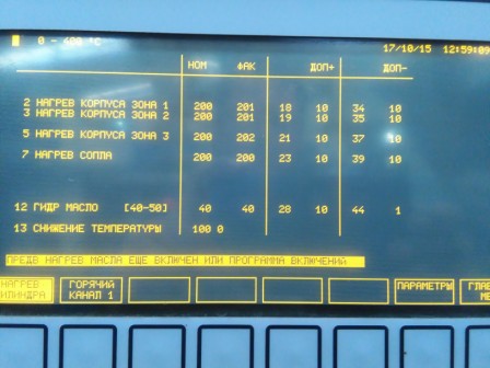 На более мощных машинах по горячему каналу предусмотрен обогрев формы, естественно, с контролем. На моих машинах его нет. На всякий случай гляньте менюшку Температуры > горячий канал, что у Вас там? Если там требует подогрева формы, надо поставить задания по факту и ввести необходимые допуски. Другое дело, что на этих машинах этой функции не должно быть. Не грех проверить Модуль памяти в контроллере. Номер на памяти должен совпадать с номером на шильдике машины. То есть 863-0252, если правильно считал (фото мелковаты).