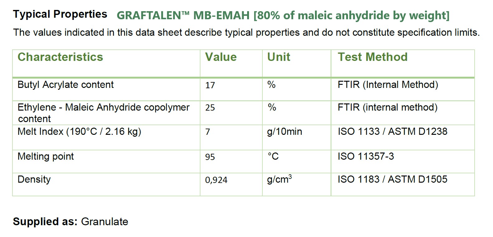 GRAFTALEN™ MB-EMAH is a copolymer of ethylene and maleic anhydride with 80% of maleic anhydride by weight.