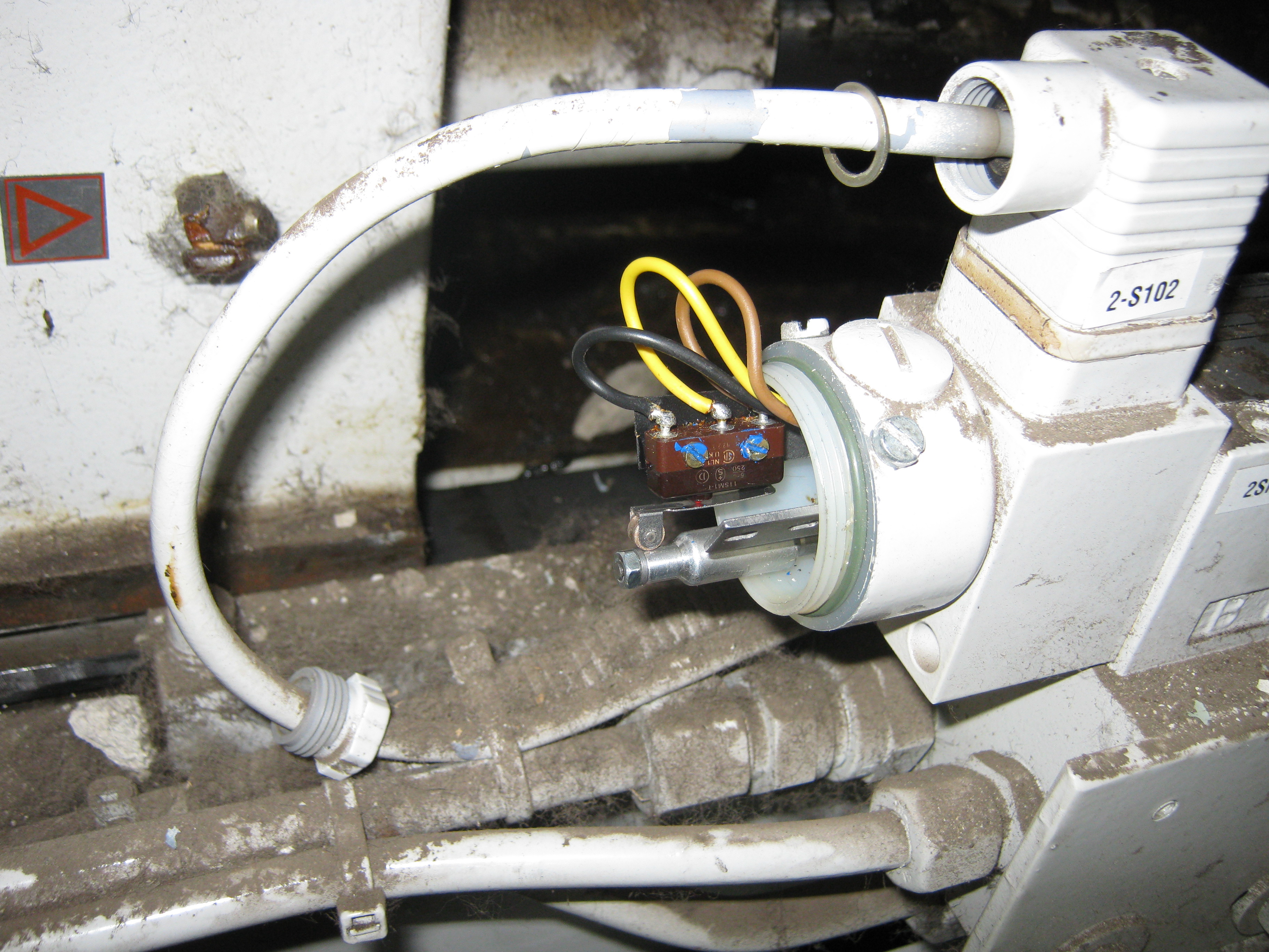 Что происходило. Во время цикла при сильной вибрации от смыкания отрубался насос. Оказалось, что пятка сработалась, разболталась и при тряске приотпускала шток. Выпрямлять побоялись из-за хилости опоры, просто прикрутили хомутами плотную резину. Прошла болезнь. У меня нашлась фотка, где снят датчик - там иногда приходится подгибать пружинящий язычок. Может поможет: Вероятность причины высокая, обязательно проверьте.