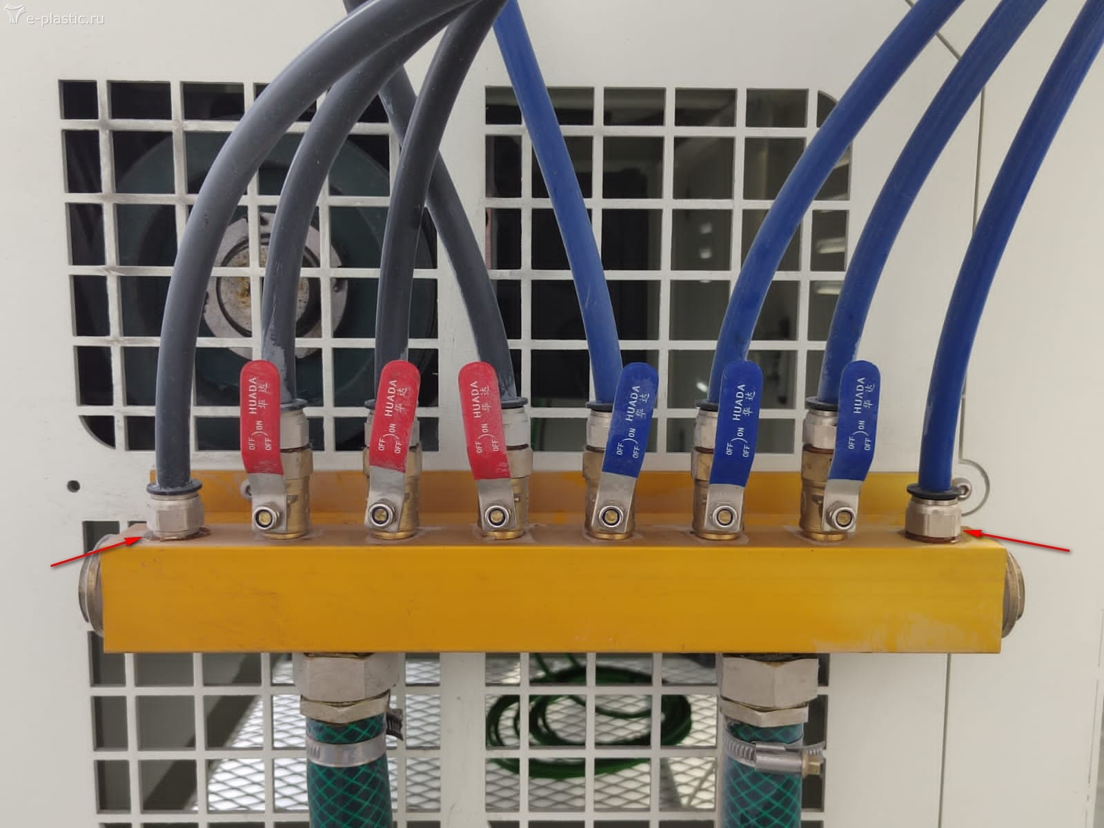 У вас что машина прямо возле чиллера стоит ? Или эти сопли тянутся через весь цех ? Кто-то вам насобирал видимо из чего было и принимал тоже спец . Тяните трубами охлаждение к машине , а там можете такую батарею повесить на сколько угодно ппотоков. Протоки видны , регулируются и температуры показывают. И берите нормальные шланги . Подходящие по температуре и давлению . Континенталь конечно не обязателен :-): но всё таки