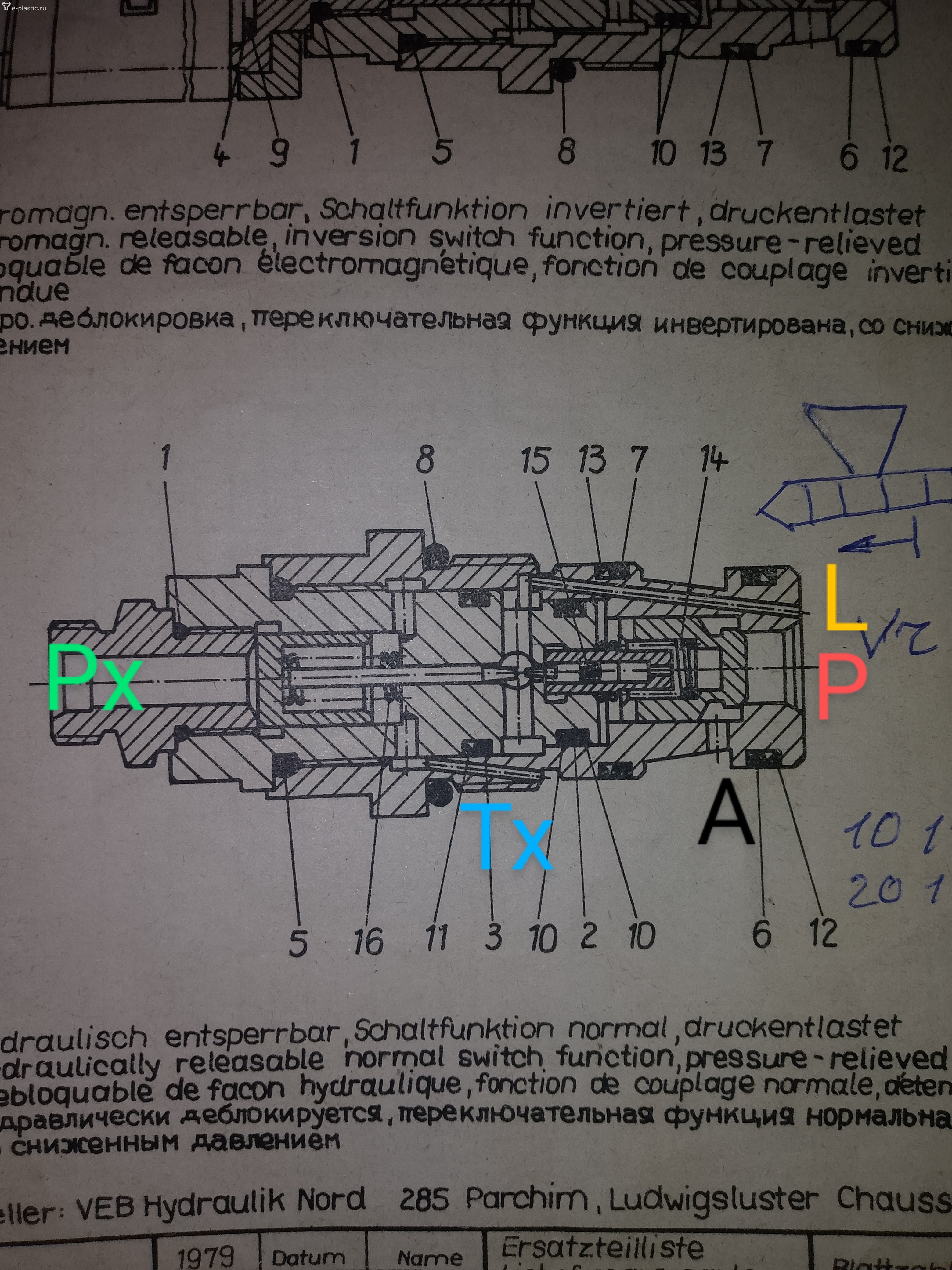 Очень плохо!!! Отечественный порядка 17000 р. Это говорит о том что остальное то же не люкса.IgorBuyuk писал(а): 07 окт 2024, 16:11271-272 пролил керосином, дунул в Р. ГерметиченЗЮМ писал(а): 06 окт 2024, 20:26 Вопрос 3) При движении формы вперёд самопроизвольно ползет сопло вперёд. А это значит что масло каким то путем попадает в штоковую полость цилиндров перемещения механизма впрыска каретки. От движения формы это не зависит. Это зависит от давления в главной магистрали общей. Глядя на распределитель видим А и В связаны с баком и полостями цилиндров. Предположим на сливе возникло давление тогда сопло поползет вперёд, поршневая сильнее штоковой. У нас же обратная картина. Трубки от точки 6 нет. И прямой связи нет. О чем была седьмая вода на кисиле. Забыли. А дело в том что если мы снимем разъем хоть со 101, хоть с набора сырья, то есть оставим поток в тупике. И включим команду в системе возникнуть давление оно же возникнет и в приходе к 271-272. Делаем вывод что тупик Р перепускает причем в канал А далее чрез Vr30 в штоковую полость и сопло поехало вперёд. На фото распред Орста ему много лет. На стол, проверка: Промываем от масла, продуваем, наливает в А,В,Т объединены. Р оставляем пустой, дуем лёгкими в Р и все станет понятно. По поводу Vr30, если с деталями порядок, внимательно отнестись к уплотнительным кольцам. Если канавка глубиной 2,5 мм кольцо 3мм.