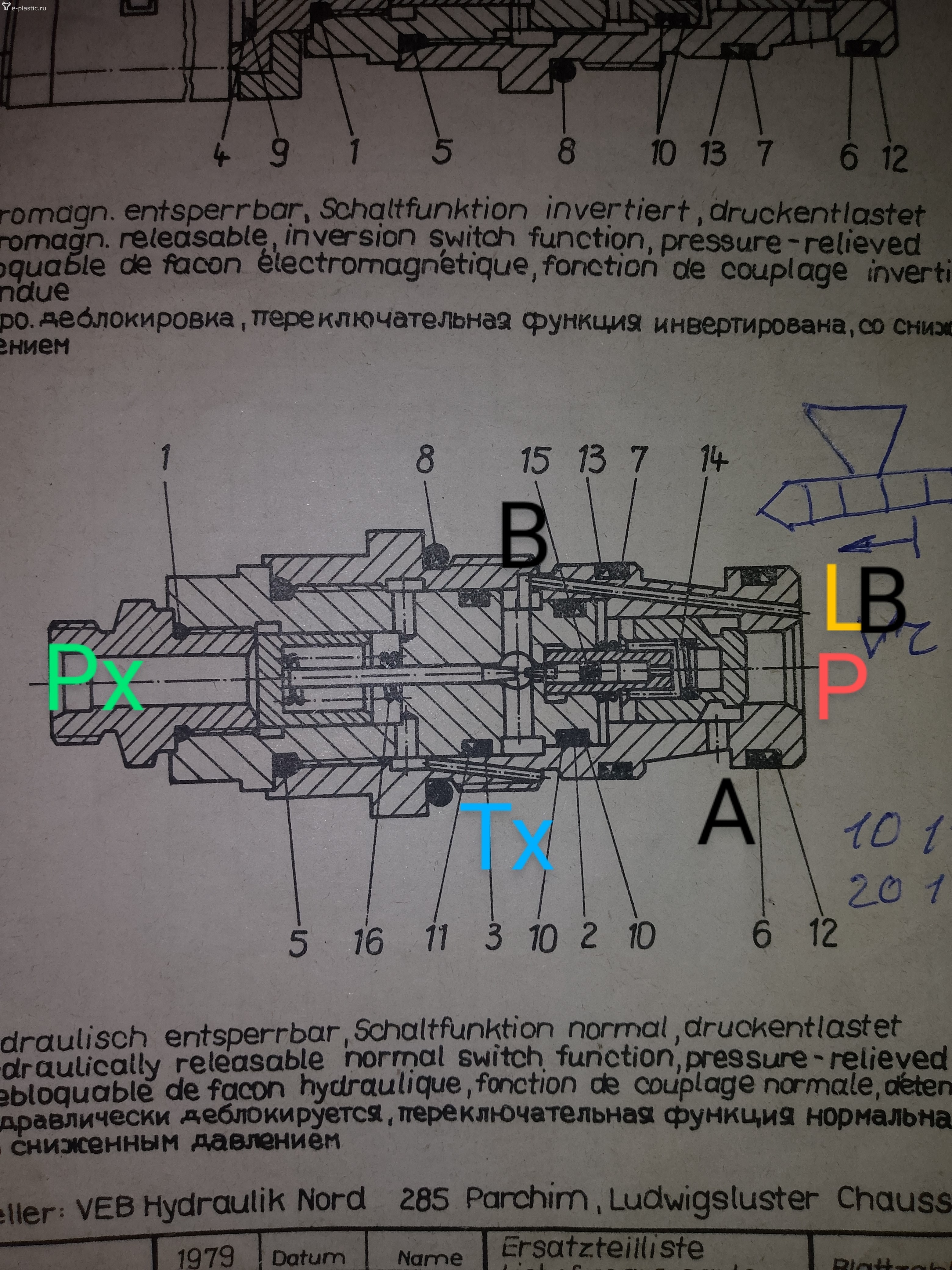 управления, слива управления, дренажа и место подключения манометра.(((((((Хорошо, L- дренаж. Y-cлив управления. Тогда какой буквой обозначим обходное сверление. В одном случае оно под давлением в другом случае оно в сливе. Могу назвать и Рх- давление управления, могу Тх- слив управления, Y- слив управления или просто канал В.... Короче, наверное про это сверление решили умолчать. Специалисту то ясно что ему понятно и по схеме или исходя из опыта. Даже если ошибка в схеме. Но поток то реверсивный у Vr30. У Vr 20 только в одну сторону. Приклеил букву В . Думаю на этом достаточно. Если нет желающих поправить, добавить, поспорить.