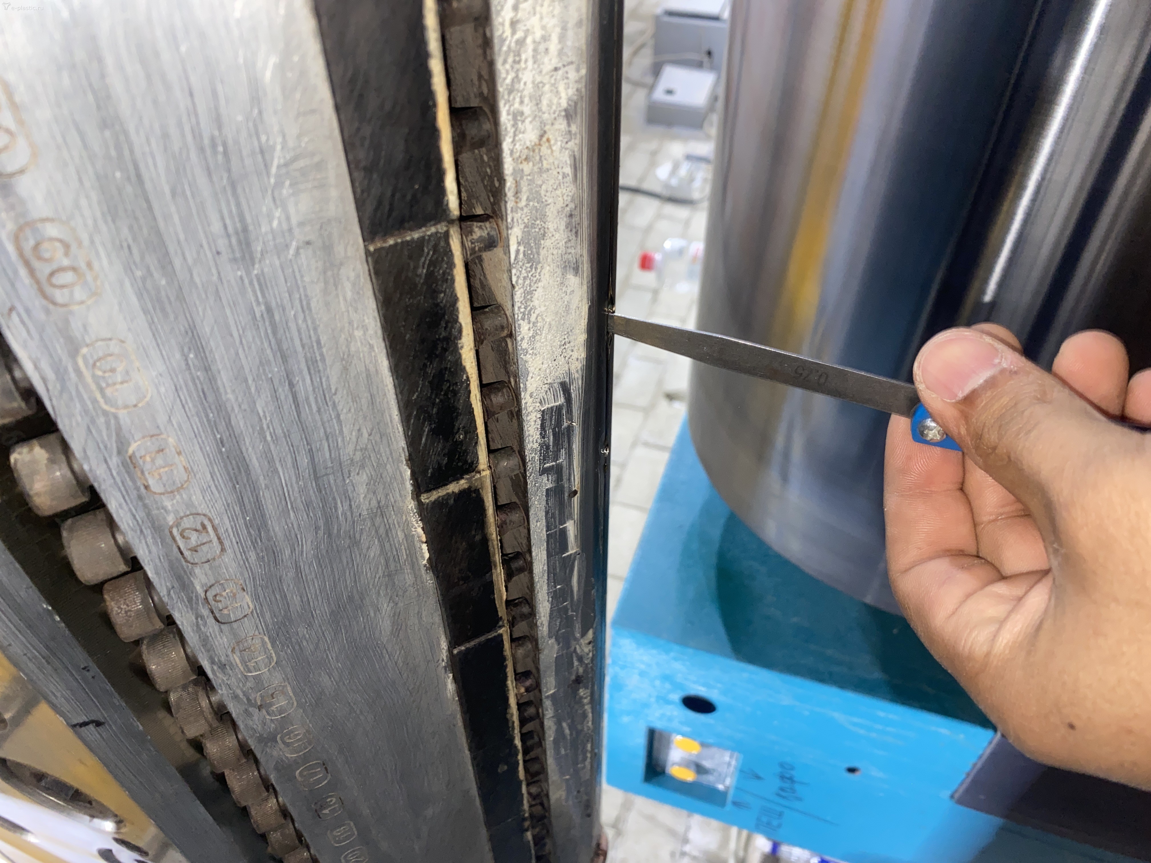 Начинте с проверки натяжения цепей привода всех валов (особенно первого, каландра, под головой). Во время работы, цепь равномерно идёт или подпрыгивает? По-моему у вас первый вал рывками работает. Если цепь подпрыгивает - это оно. Тогда меняйте цепь, они быстро растягиваются, но копеечные.