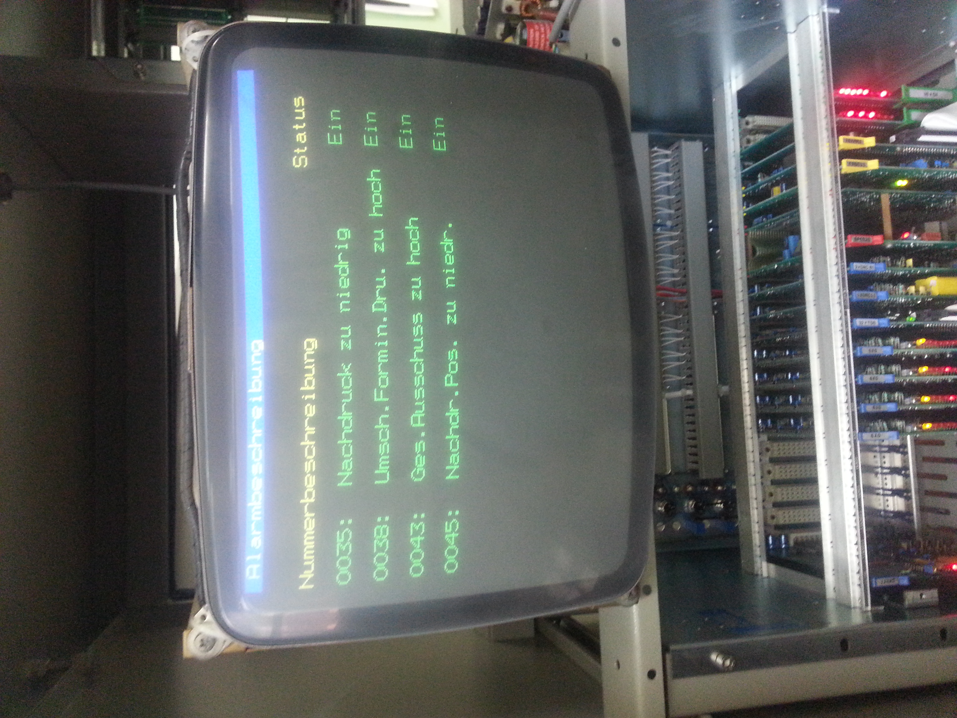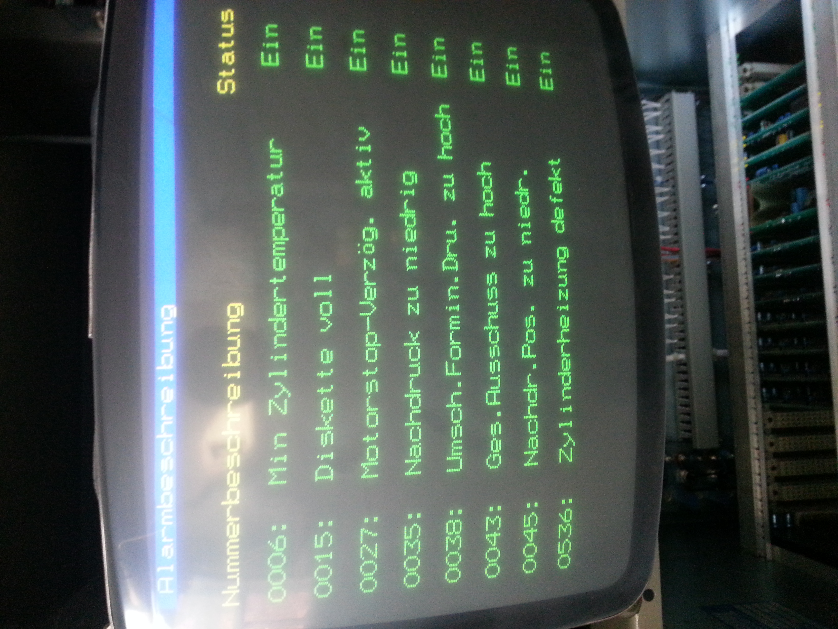 В меню ошибок находится запись 0035. Там много странного. Написано: Diskette voll. Там нет дисковода флоппи, а он задан. Не сочтите за труд переписать машинные данные с RAM-диска - остальная технология уже палки-веревки - любой наладчик освоит. Главное задать конфигурацию машины и настройки ПИД-регуляторов. Это проще в одном загрузочном цикле сделать. Иначе по записям смену клавиши жамкать.