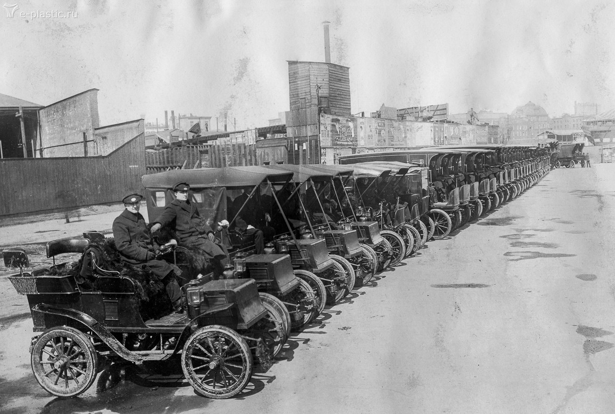 Выстроенные в ряд электромобили Edison Company на Манхэттене в Нью-Йорке, 1906 год