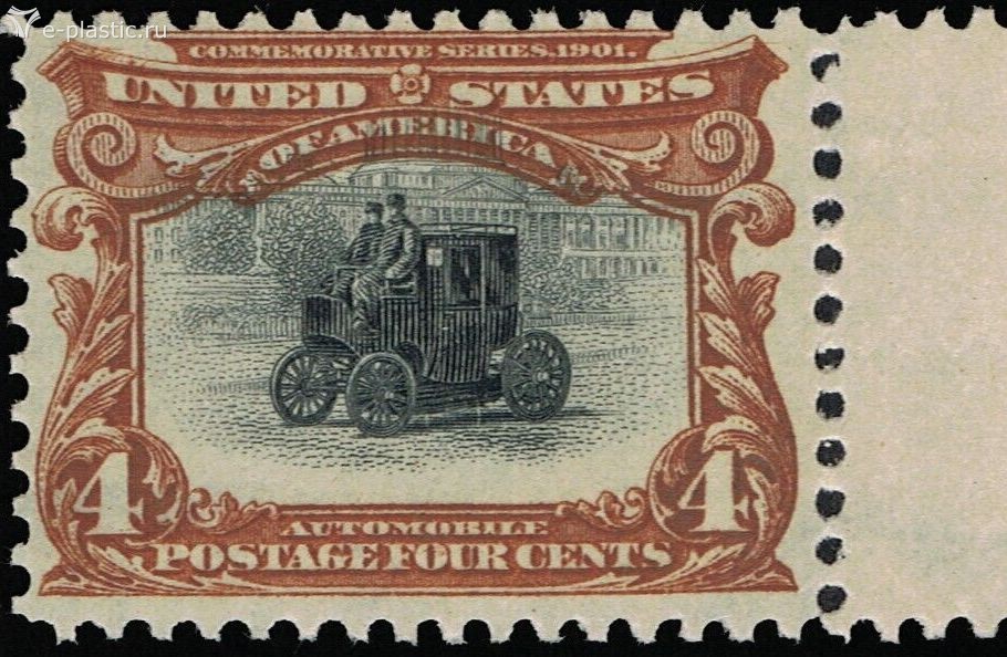 Первой маркой, на которой был изображен автомобиль, является марка Michel № 134 (Scott № 296) США 1901 года.