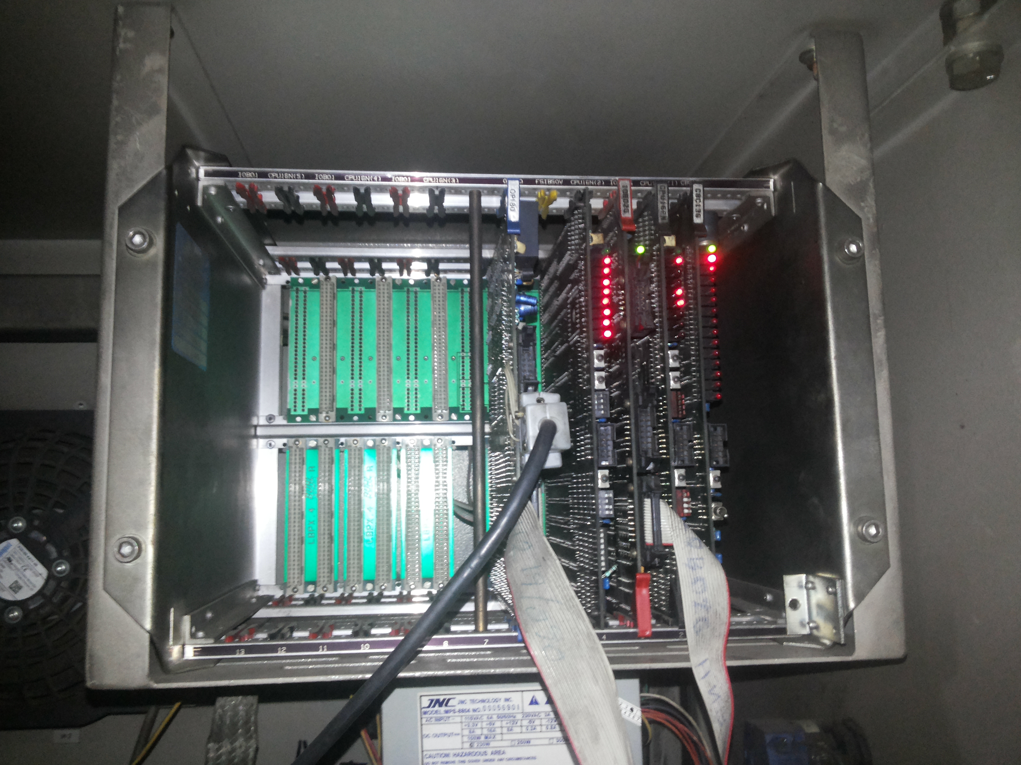 С питанием получилось. Вопрос остался по поиску появившейся неисправности. На платах выходов 6Х0 не горят желтые светодиоды. На 2-х горят все красные. При перестановки горят красные на тех же платах. На фотографиях состояние контроллера и процессора при отсутствии связи м/д ними и когда имеется. На плате CBC136 мигает 2-й красный диод сверху.