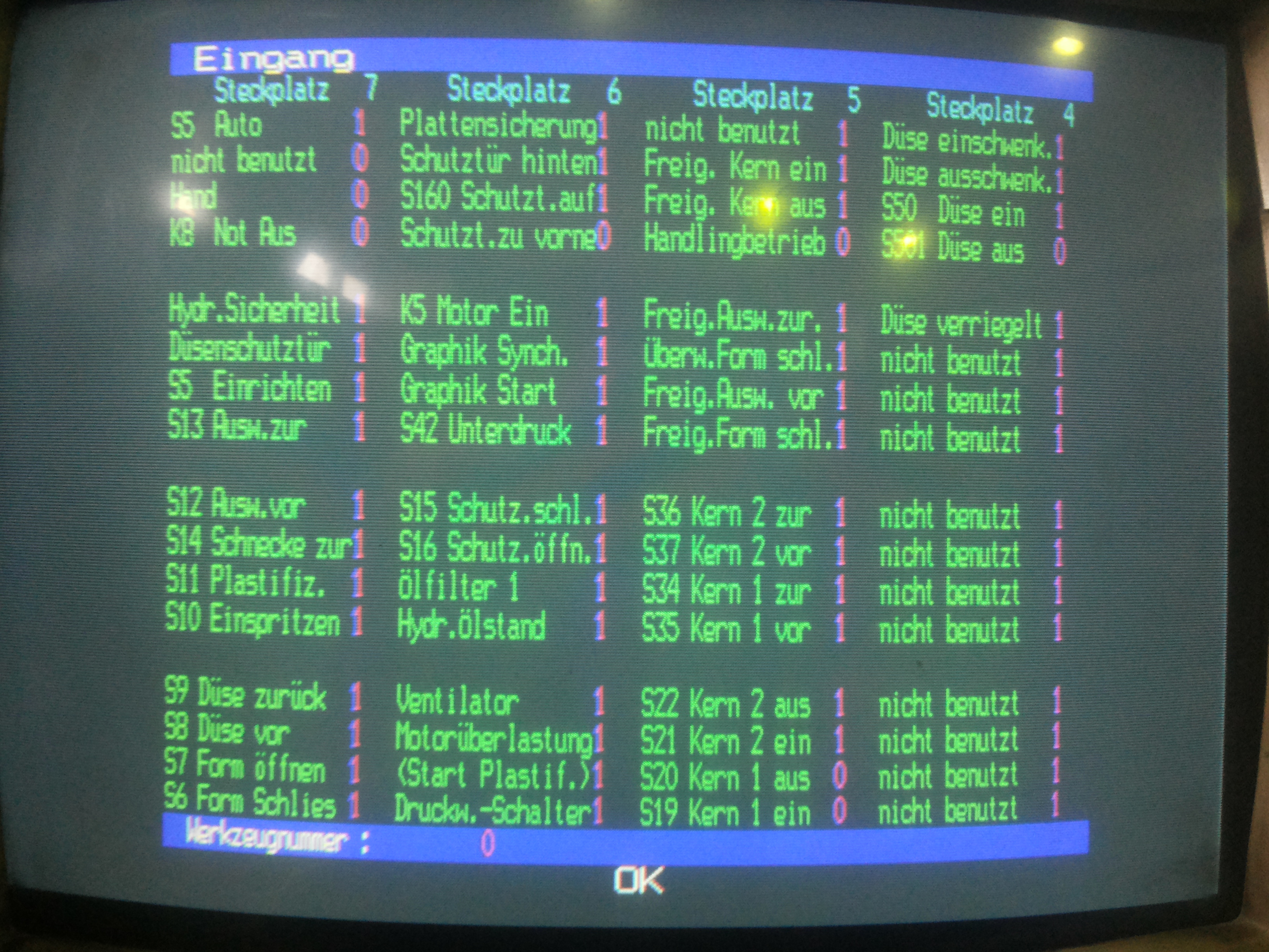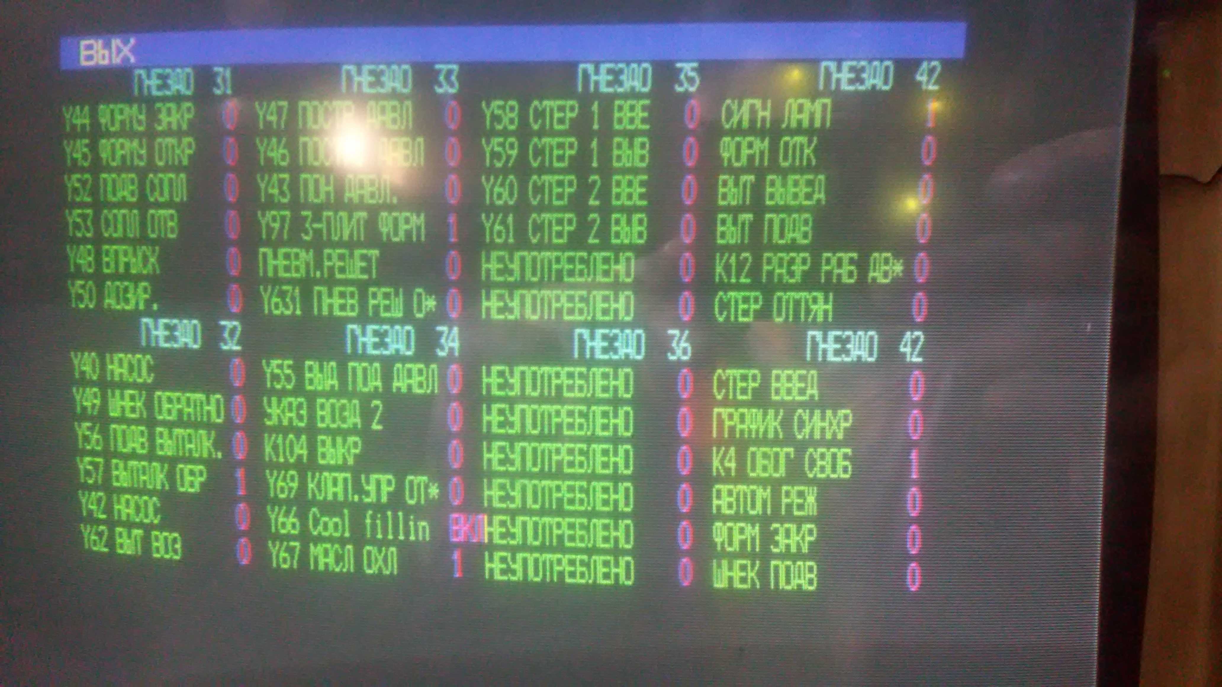 Во! С этого и надо было начинать. Абракадабра полная во входах-выходах. Вот не пИшите, как все начиналось, экономите буквочки - а зря. Разница большая, ведь, какая предистория. То ли машина после простоя, то ли вчера работала, а сегодня хрен. Похоже у Вас системная программа слетела. На верхнем уровне плата СВС. Аккумулятор, скорее всего, дохлый. Его можно прямо на вытащенной плате заряжать.dm09 писал(а):Еще вопрос. Отображение входов и выходов после инициализации. У всех так. На многих неиспользуемых входах 1.