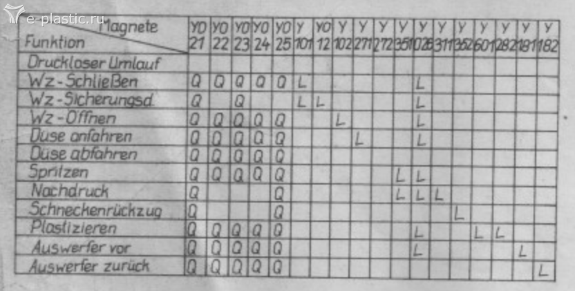 21 активирует насос одну секцию. 101 посылает поток масла к цилиндру закрытия подвижной плиты. В клетках включение солиноидов на то или иное действие.