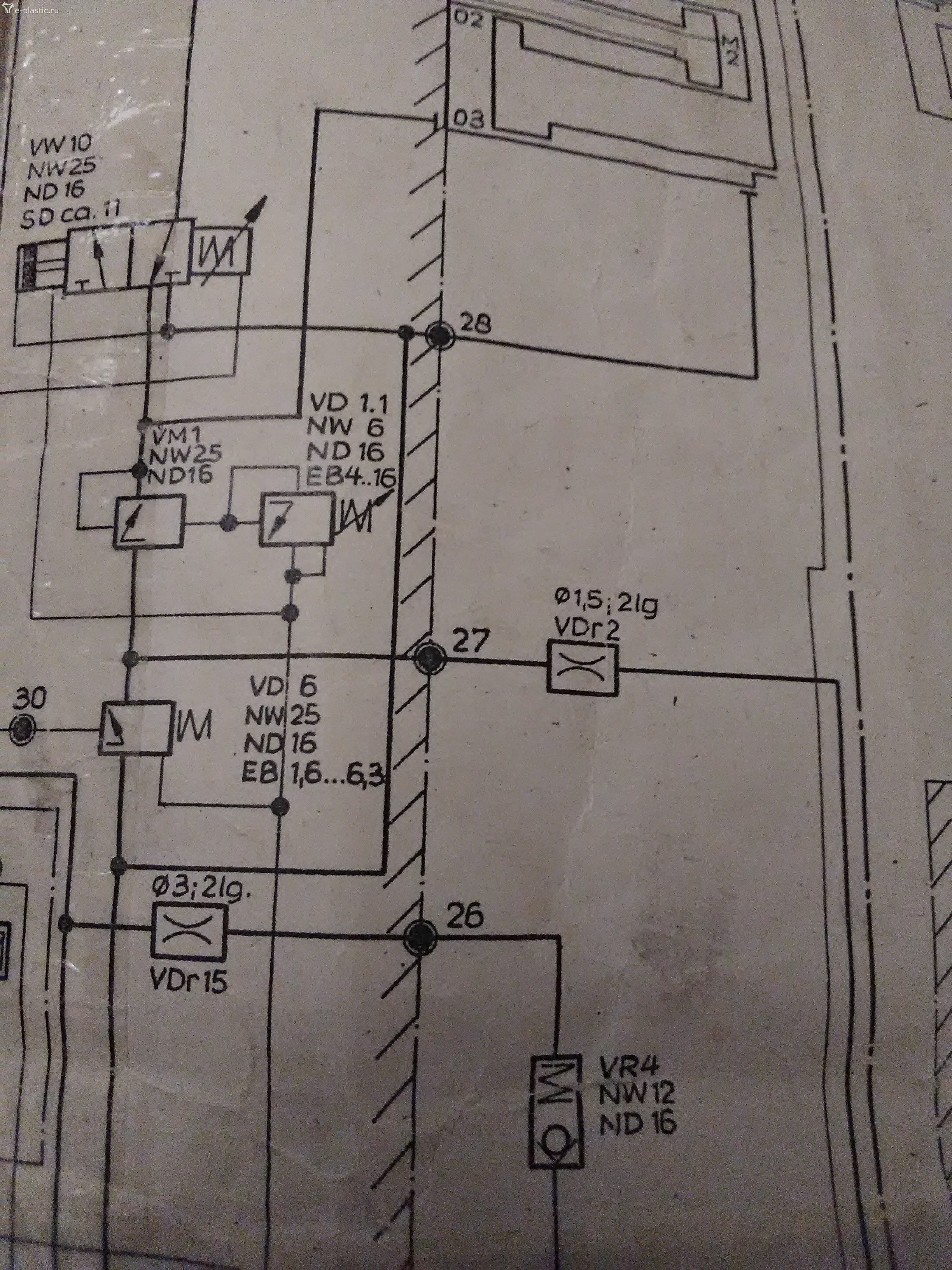 Поток высокого давления в линию прижима сопла начинается в точке 27. В наконечнике трубы, вваренном выполнен демпфер VDr2- 1,5 мм ( первая причина засор) далее труба уходит к блоку прижима сопла в точку 5 и там в блоке ещё демпфер VDr 16 -1,5 мм.( засор, вторая причина) далее обратный клапан VR8 , далее VM4 редакционный клапан с диапазоном настройки 40-160 атмосфер. Далее VR5 управляемый обратный клапан. Далее точка 10. В районе точки 3 поток раздваивается. В верх понятно к цилиндрам и манометру правому , а вниз поток уходит к гидростанции по длинной трубе к баку на блок рядом с насосами и обязан запереть обратный клапан VR1( третья причина трудно доступная) герметично и по ответвлению принудительно разгрузить VD2 ( вот почему левый манометр должен соскочить на чистый ноль) При этом весь литраж идёт на охлаждение и фильтрацию) Остальные аппараты по пути менее уязвимые на мелкий мусор. Но обслужить можно. Далее фото где это находится и как выглядит на фрагментах схемы.