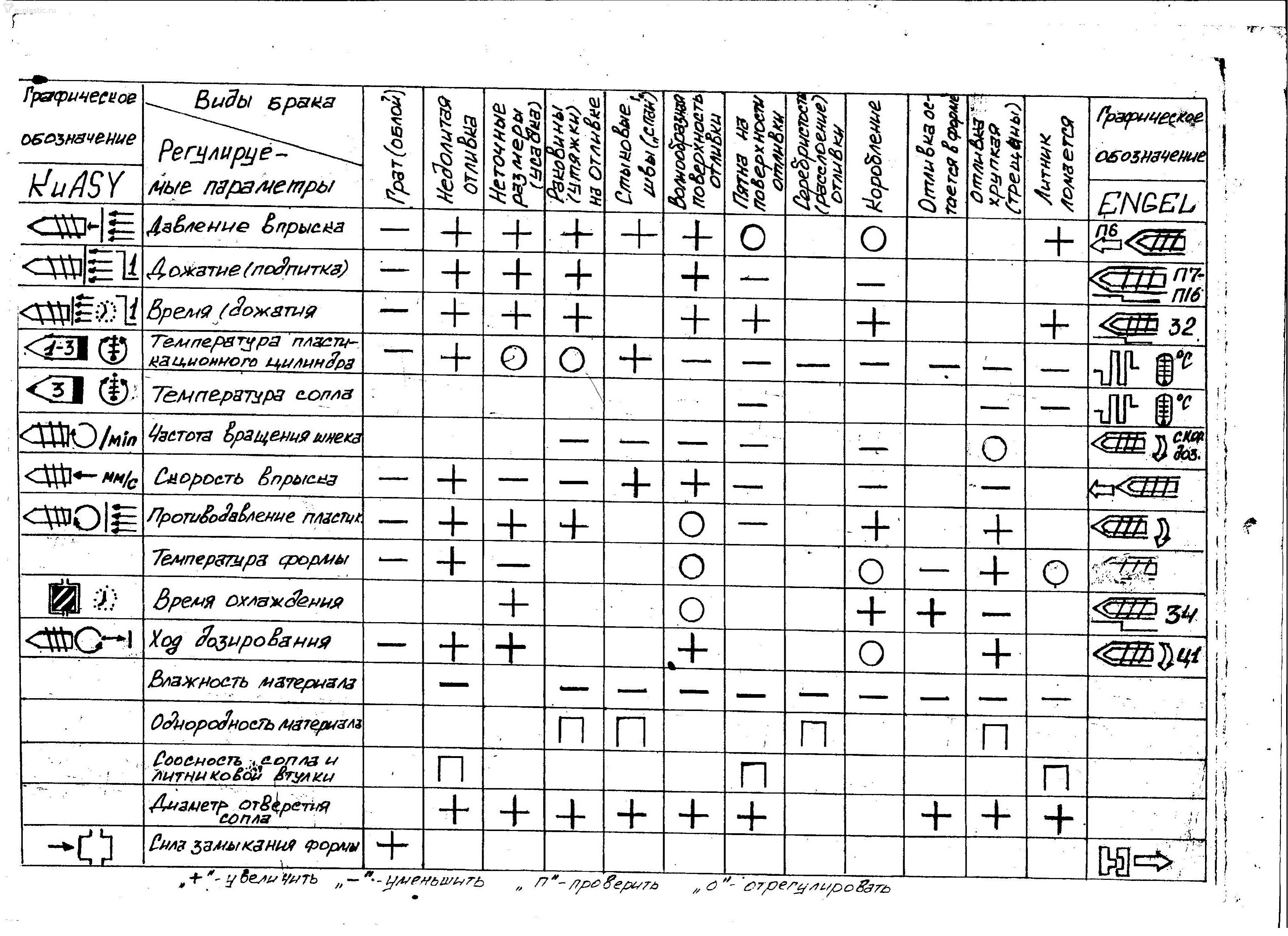 https://e--plastic-ru.turbopages.org/e- ... davleniem/ Доброе утро. А наладчик на других ТПА есть? Он и должен знать, что убавить ,что прибавить. Рычаги управления параметрами схожи на всех ТПА. Есть группа регуляторов во власти наладчика. Есть группа регуляторов опломбированых заводом. Они во власти механика гидравлика. Таблицы параметров управления литьём. Хорошо распечатать и закрепить на ТПА. Вопросы? Уточним. Регулировки параметрами и клапана в теме. Все примерно как на всех ТПА. Приклеить шильдики на них за что отвечают. В помощь для понимания процесса. Ответ на вопрос, что крутить, и чем ограничится? В таблице видно что крутить. Возможностей много. По факту и необходимости и требования к качеству изделия. Не менять настройки несколько параметров за один раз. Не поймёте динамики. Только по одному параметру, две три отливки, смотрим изменения на изделии. Спешка тут неуместна. Нужна подготовка тренировка.