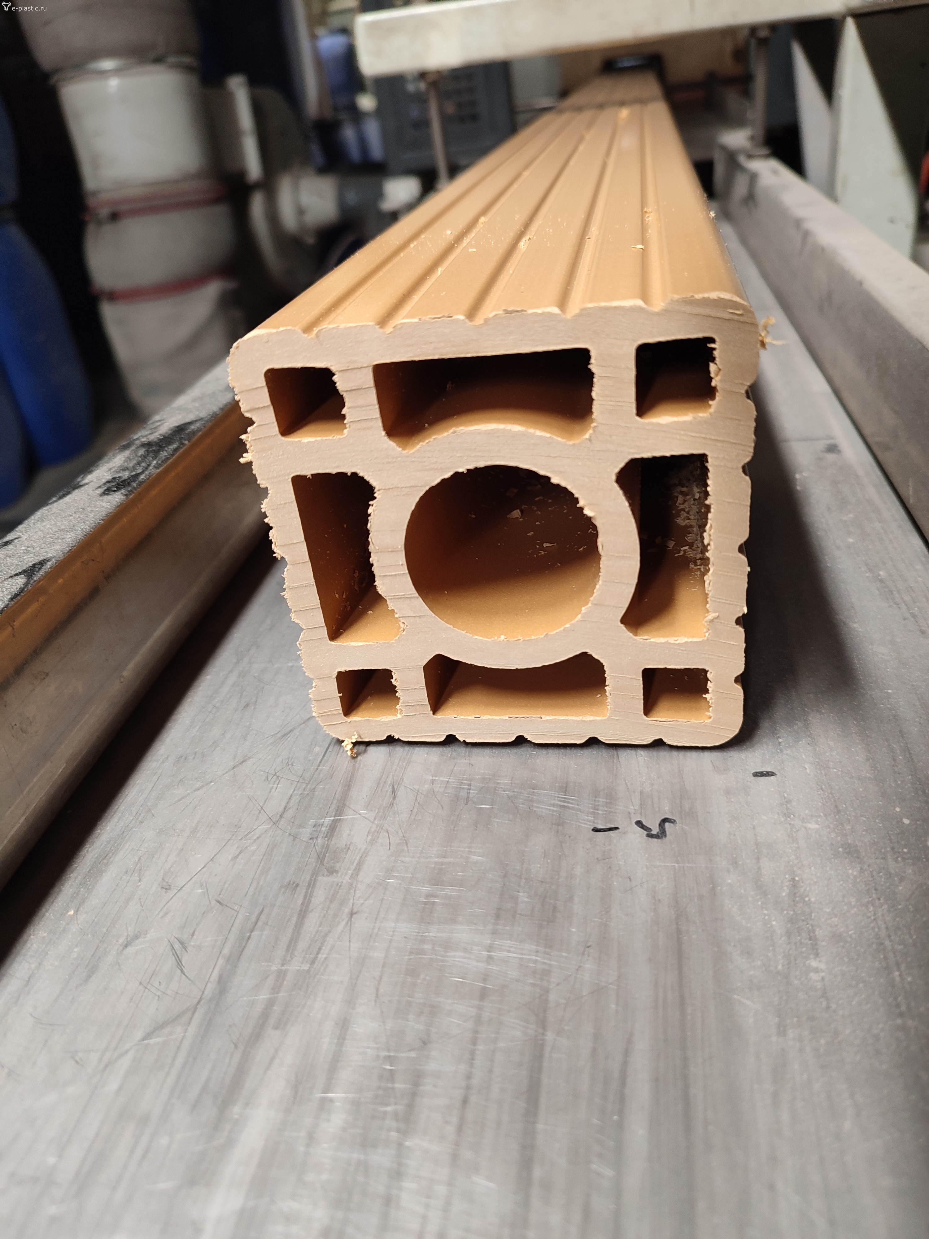 Американцы очень давно делали такую полнотелую доску Начинали с этой технологии. заполняя корпуса калибров экструдером. Один за одним. Такой калибр потом погружали в ванну для охлаждения. Сейчас они научились делать Ж\д шпалы. Кста. У нас под столицей тоже есть такое производство. Уже лет Аять тестируют на исп. ж/д кольце под Москвой