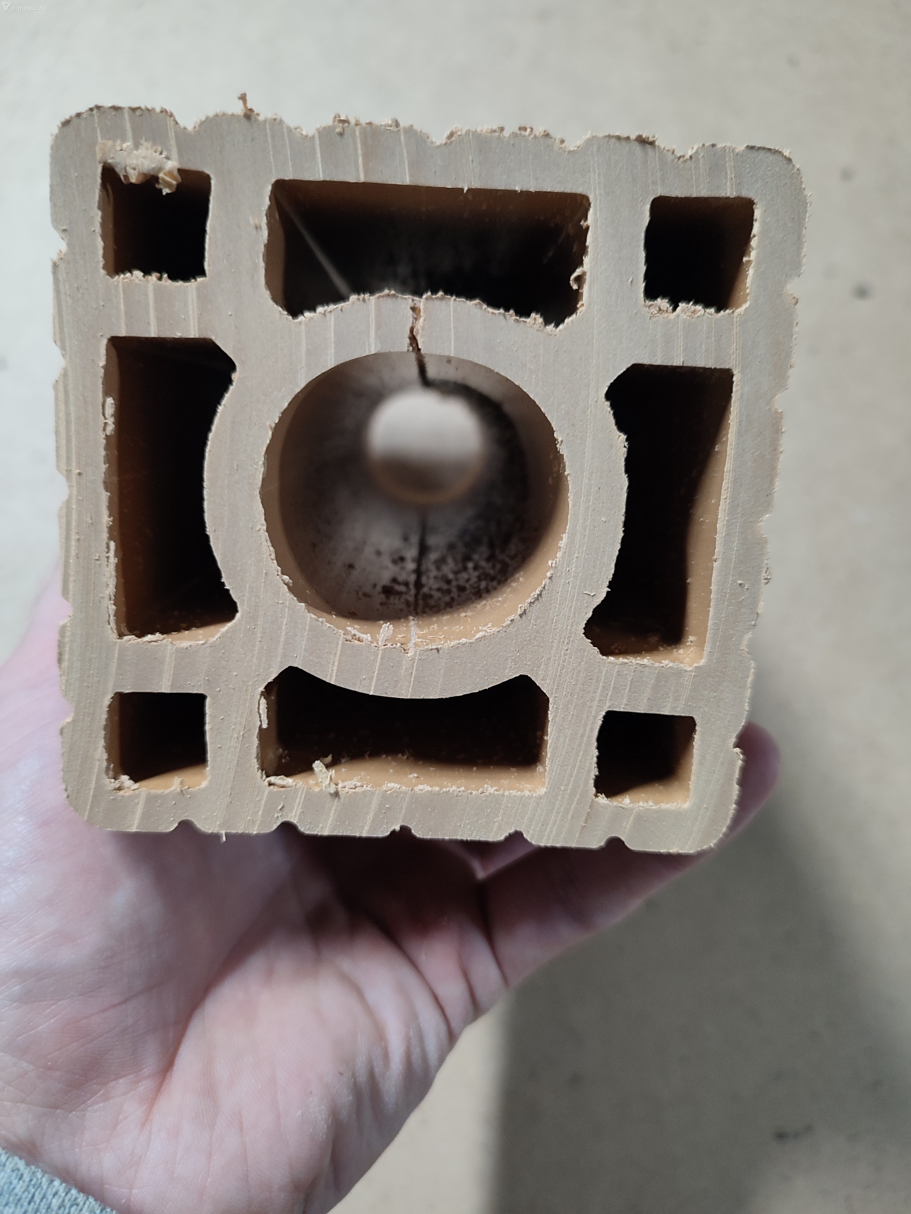 Здравствуйте. Я работаю оператором экструдера на производстве ДПК. Мы производим столбы ДПК 100x100 (полые с круглой сердцевиной). Используем древесную муку хвойных пород и ПНД. Очень часто при экструзии начинает подниматься давление на экструдере и при этом лопается круглая сердцевина внутри столба. Всегда в одном и том же месте, сверху вдоль всего столба. При попытке уменьшить скорость вращения шнеков давление немного снижается, но сразу же портится внешний вид столба. Углы становятся намного светлее граней и немного шершавыми. Иногда появляется "мраморность " на углах.