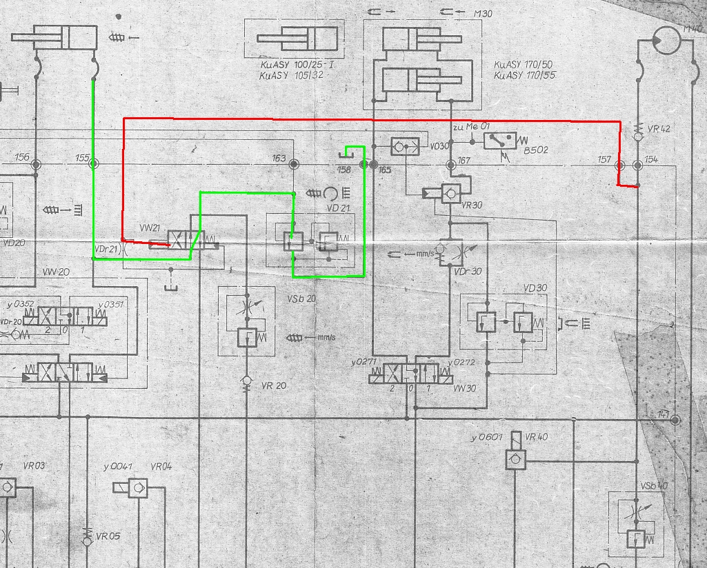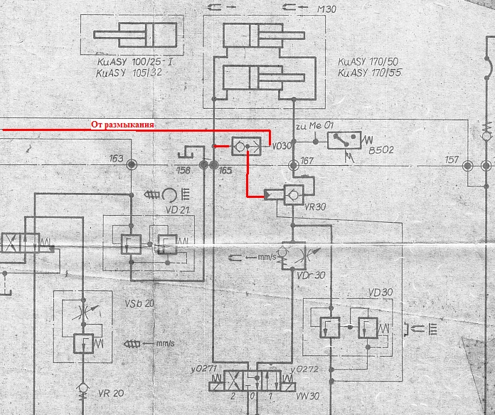 Как я понял из разъяснений, прижим сопла набирает давление и после этого магнит У272 надо отключать. У меня после отключения У272 давление прижима уходит в течение секунды. Проверил, что давление не уходит через сами цилиндры, т.к. при включении У272 и прижима системное давление не падает, стоит как влитое. Нет утечки и через распределитель манометров, т.к. если не включать режим измерения давления прижима, то все равно давление уйдет.