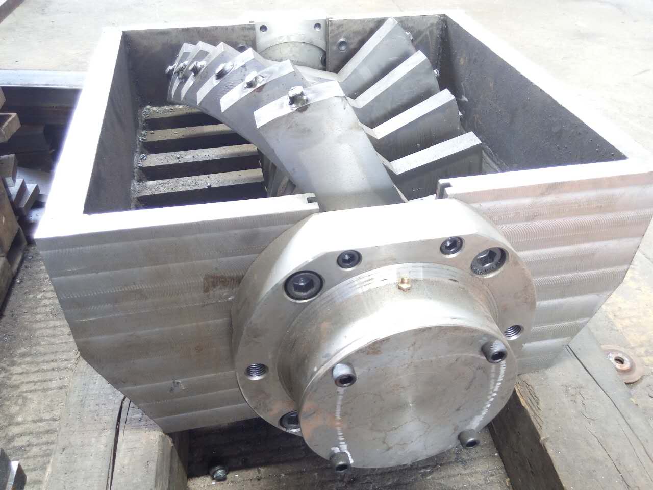 На данном этапе роль ворошителя выполняет работник. Это удобно, но не правильно. А самостоятельно лёгкая стружка отказывается падать между витками питателя. Ещё пробовали вариант, когда тот же работник просто отрывая кусочки "мочалки" кидал между витками. Но и это не дало желаемого результата. Сейчас думаю об изготовлении маленькой ручной гильотинки. Три-четыре неподвижных ножа вперемешку с подвижным (как ножницы), дабы кромсать стружку. Ведь после распиловки больших отходов на циркулярке, мелкую стружку собираемых и гранулируем. Если "ножницы" дадут результат автоматизирую процесс резки стружки.