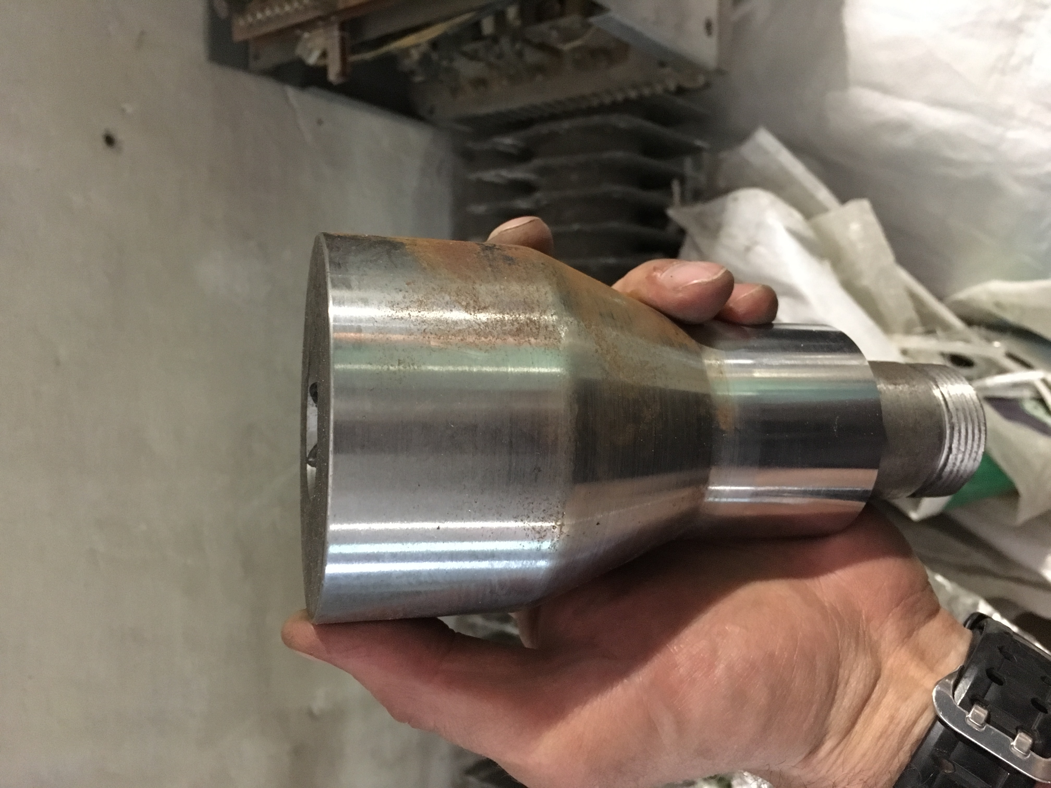 Чулок гормошкой не складывается,бывает при повышении шнека,пузырь уходит в верх,но я вроде научился с этим бороться,добавляя обдув и временно уменьшая обороты шнека. По поводу 1зоны,там стоит маленький тен,с напругой 1А. До этого стоял более широкий,с ним датчик тоже показывал 1 А,но он был широкий и почти в плотную подходил к отверстию загрузки и часто козлился из за этого. Работаем без водяного охлаждения,охлаждение идёт только на подшипник(фото скидывал выше первой зоны,там видно с низу два штуцера под воду).температура 1зоны может припятствовать поднятию оборотов,может дополнительно поставить ещё один узенький тен на 1А?? На фотографии 3зона и Аней какая-то квадратная болванка вкручена,что это такое,или что на этом месте должно быть? Так же фото Дорна