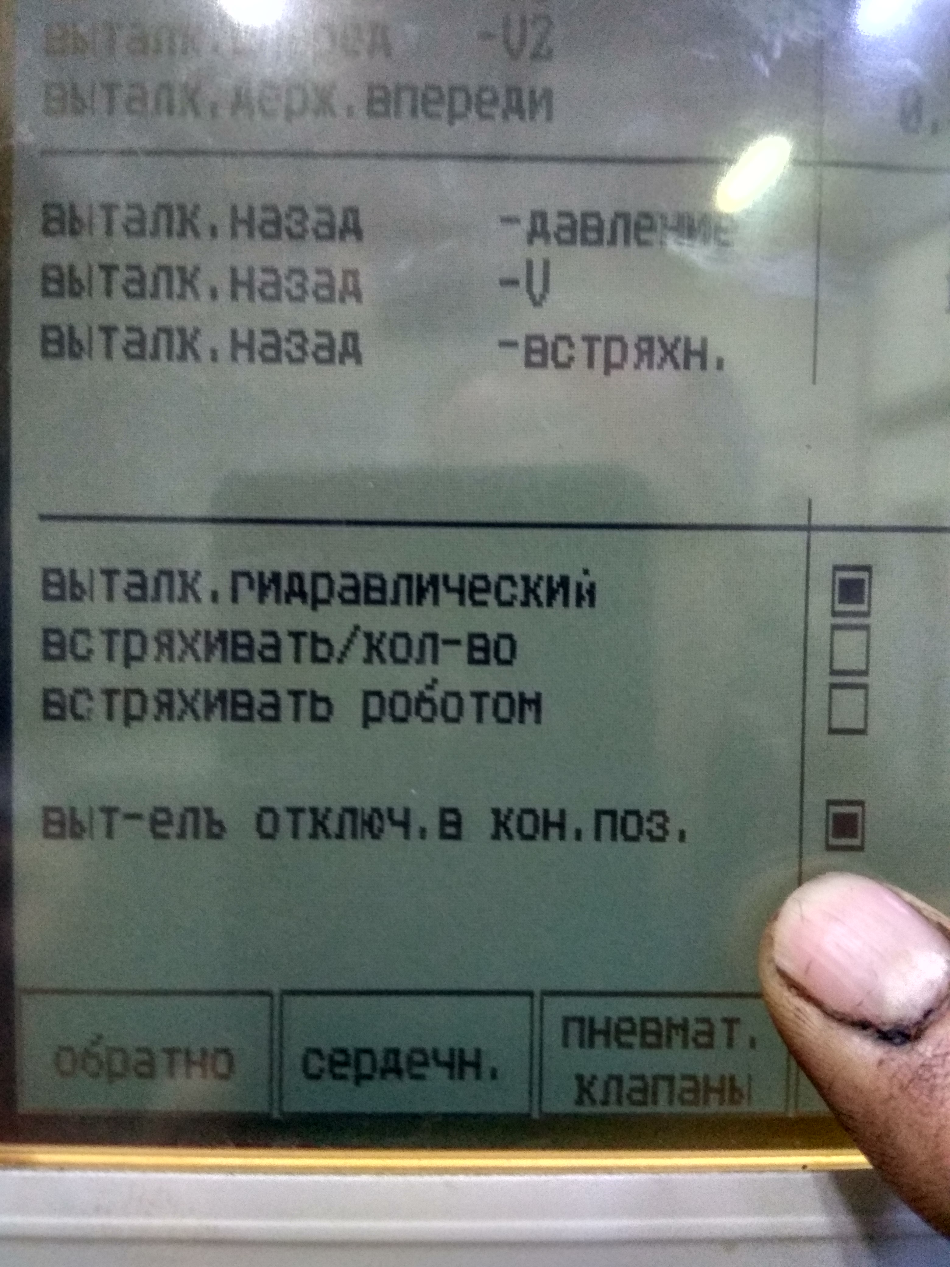 Ещё 2-Y81. Третий снизу. Что за магнит? Теперь о толкателе. Он у вас не в конечных положениях, а где сейчас находится его точка "выталкиватель сзади"? Она учитывается при движении плиты, есть определенная запрещенная область. Вполне может приводить к сбою, если состояние "сзади" оказывается на границе ограничения. Тогда можно было свалить на нагрев масла. Дело в том, что пока масло не нагрелось, то из-за инерционности он может пролетать 2...3 мм, преодолевая критическую точку, а при нагревании масла энергии может не хватить и он остановится ближе, попадая в запрещенную зону. Но это умствования, так, к слову.