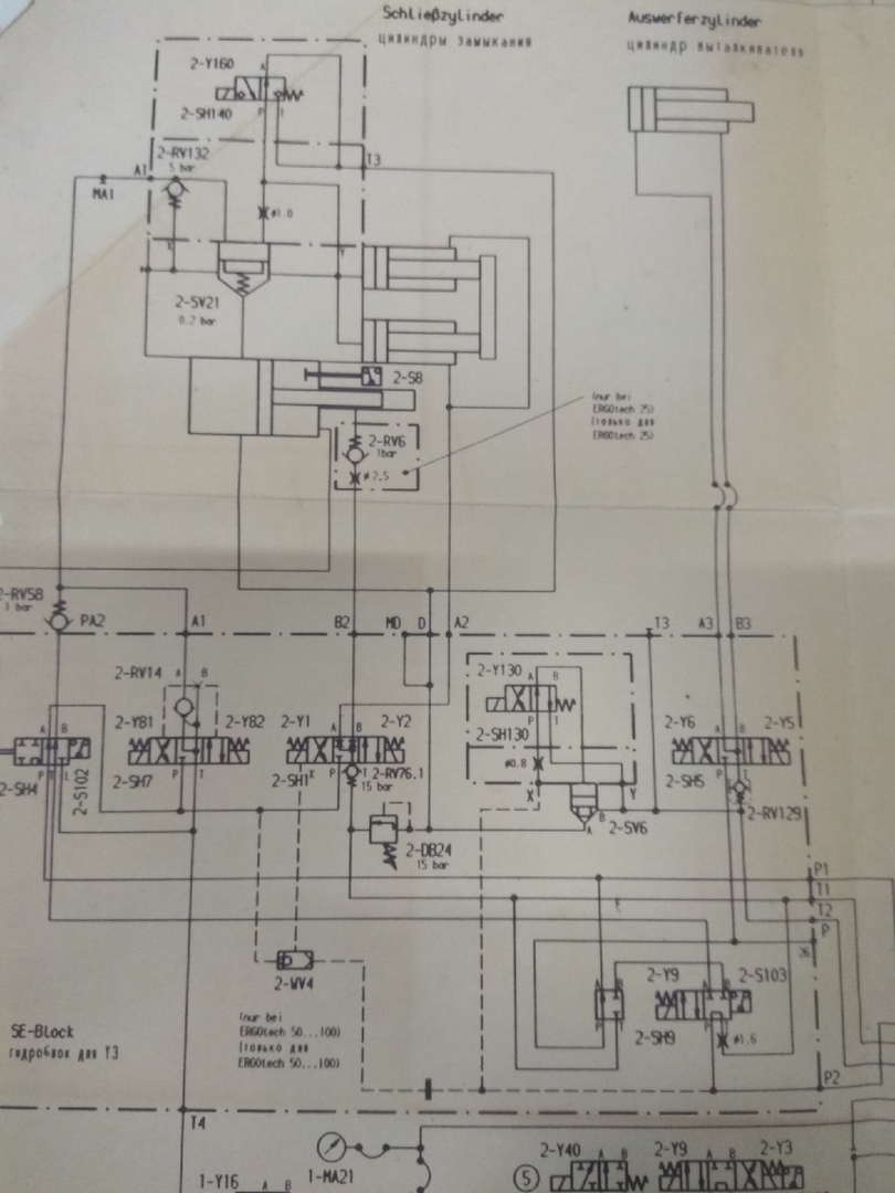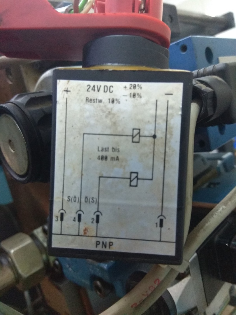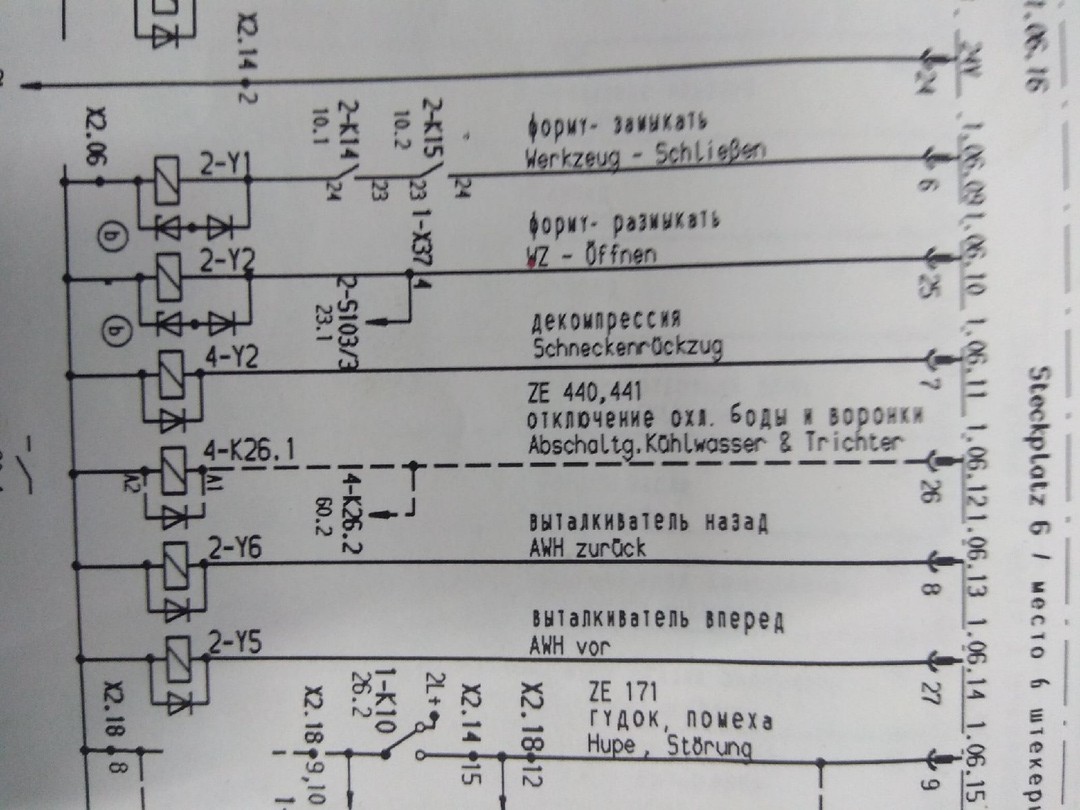 Теперь, как все это работает. Ко входу 1.05.01 через диод подключен датчик вращения шнека 4-B16. По нему оценивается скорость его вращения. Сюда же подключается через диод 2-S103. Включено по "или". Питание на него приходит с выхода 1.06.10 "Форму разомкнуть", а именно с 2-Y2. Вот здесь то собака и порылась. 2-S103 ничего не выдавал. Этот датчик стоит на распределителе 2-SH9. По сути он контролирует включение магнита 2-Y9.