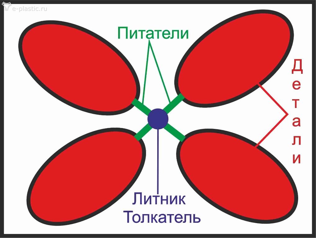 Так вот- в центр(литник) подается расплав и крестом по матрицам. Оттуда же потом вылазиит толкатель и вместе с крестом выталкивает детали. Если как умудриться через центральное отверстие вакуум подать...
