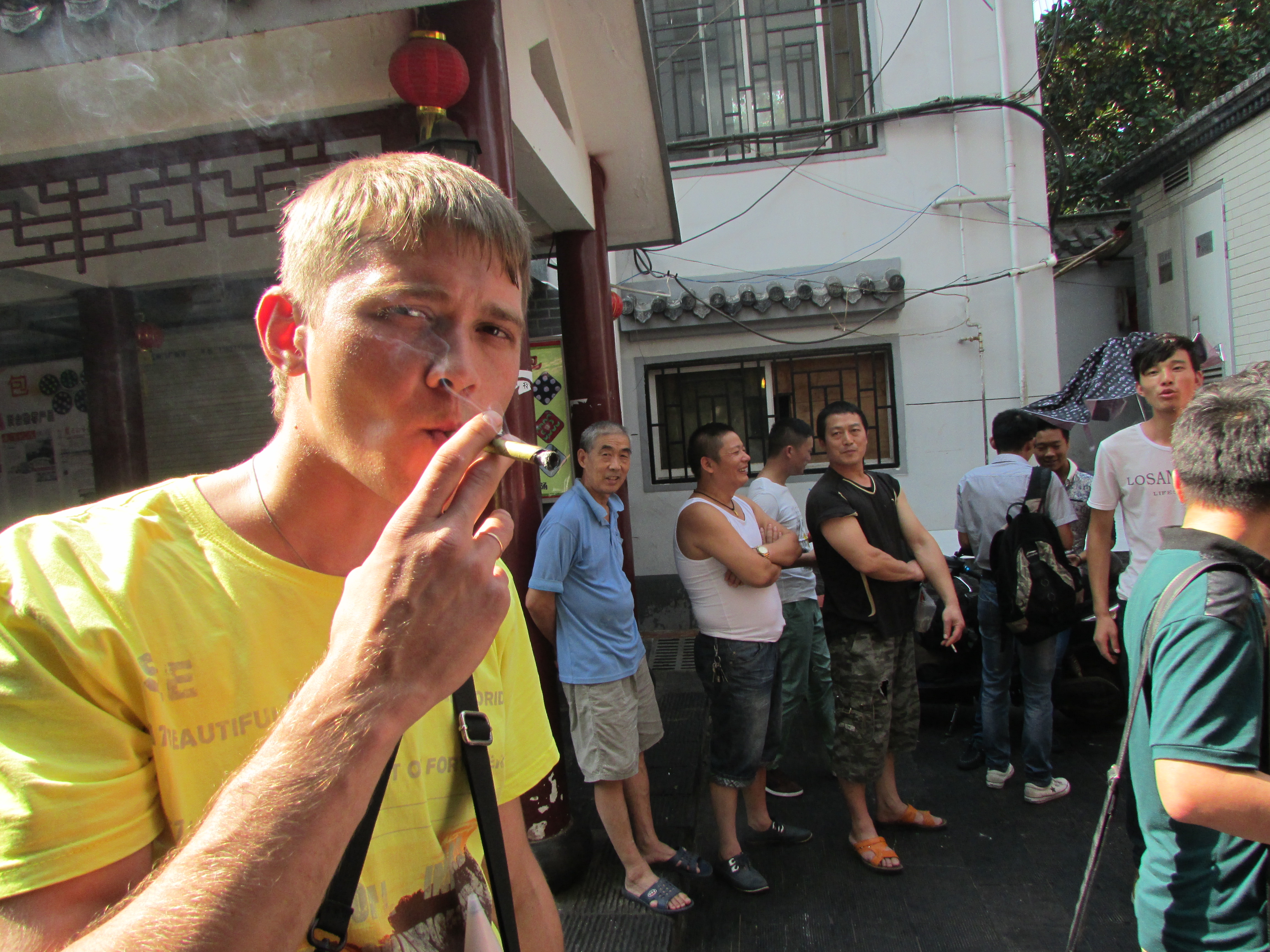 Кстати, на той же улице сигаретный киоск нашёл (фото прикладываю). Китайцы на меня смотрят в ожидании, то ли: захлебнусь, подавлюсь, отравлюсь ли)) а чего смотреть-то?!)) Я и тогда по 2 пачки в день "Явы" красной скуривал. Защищён я Лёха, от малыша твоего, а то может и с ним также живу,... да скорей всего))