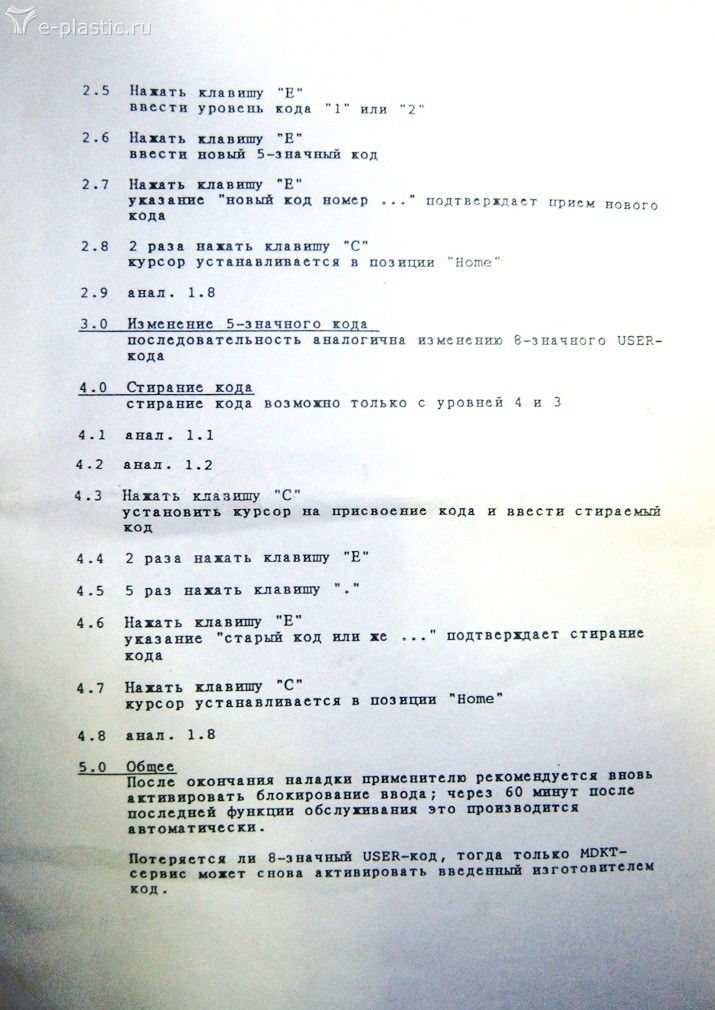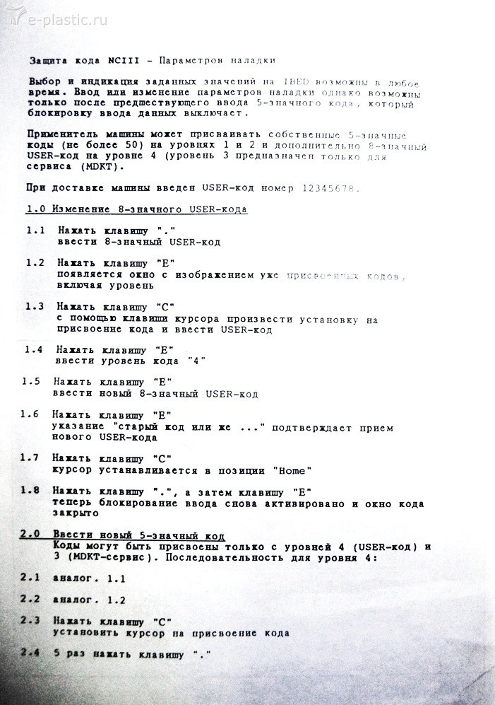 Нажимаем на пульте кнопки 0 и 9 и затем вкючаем автомат 1-F9. Кнопки держим после этого ещё секунд 10. Все маски на дисплее обнуляются. Не должно быть старых значений, вопросиков - только нули. Заводим последовательно все цифры и значения по процессу. После этого отбиваемся по нулям ( см. экран на предыдущей странице) и машина готова к работе. Может потребоваться несколько перезапусков. Поскольку эти перезапуски приходится выполнять довольно часто, то у наладчика все цифры на разные ПФ записаны в тетрадку. Ну и технологи дают параметры процесса. Ничего сложного.