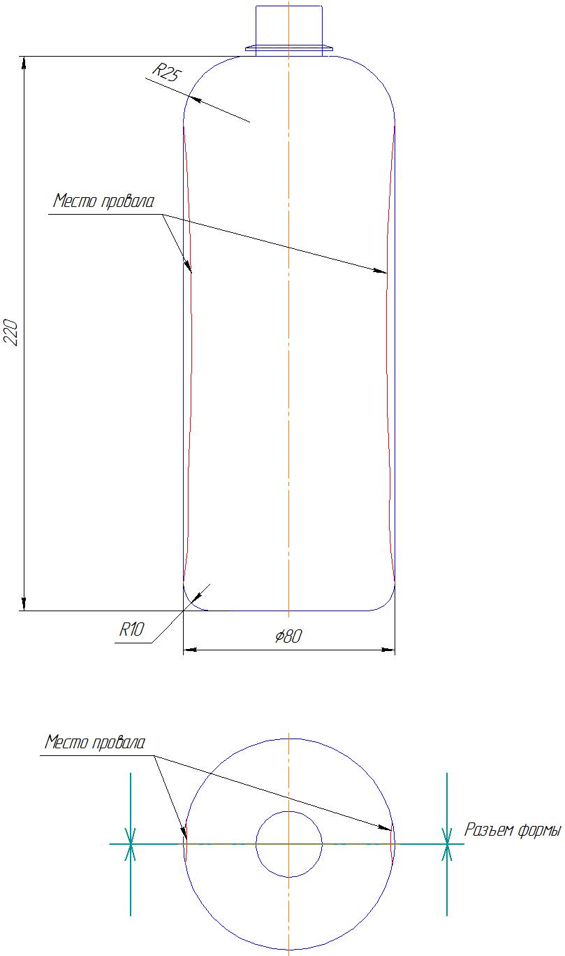 Проектировал форму на бутылку 1 л (круглая диаметром 80 мм). При испытании этой формы бутылка вышла с "упалыми" боками на линии разъему формы с двух сторон (фото добавляю). Заказчик говорит поправить форму, но на форме в сечении все нормально, радиуса R40 (где как раз и является дефект). Возможно дело все же в наладке формы? (На испытании не был, режимов и технические параметры ПЕТ формы не знаю)