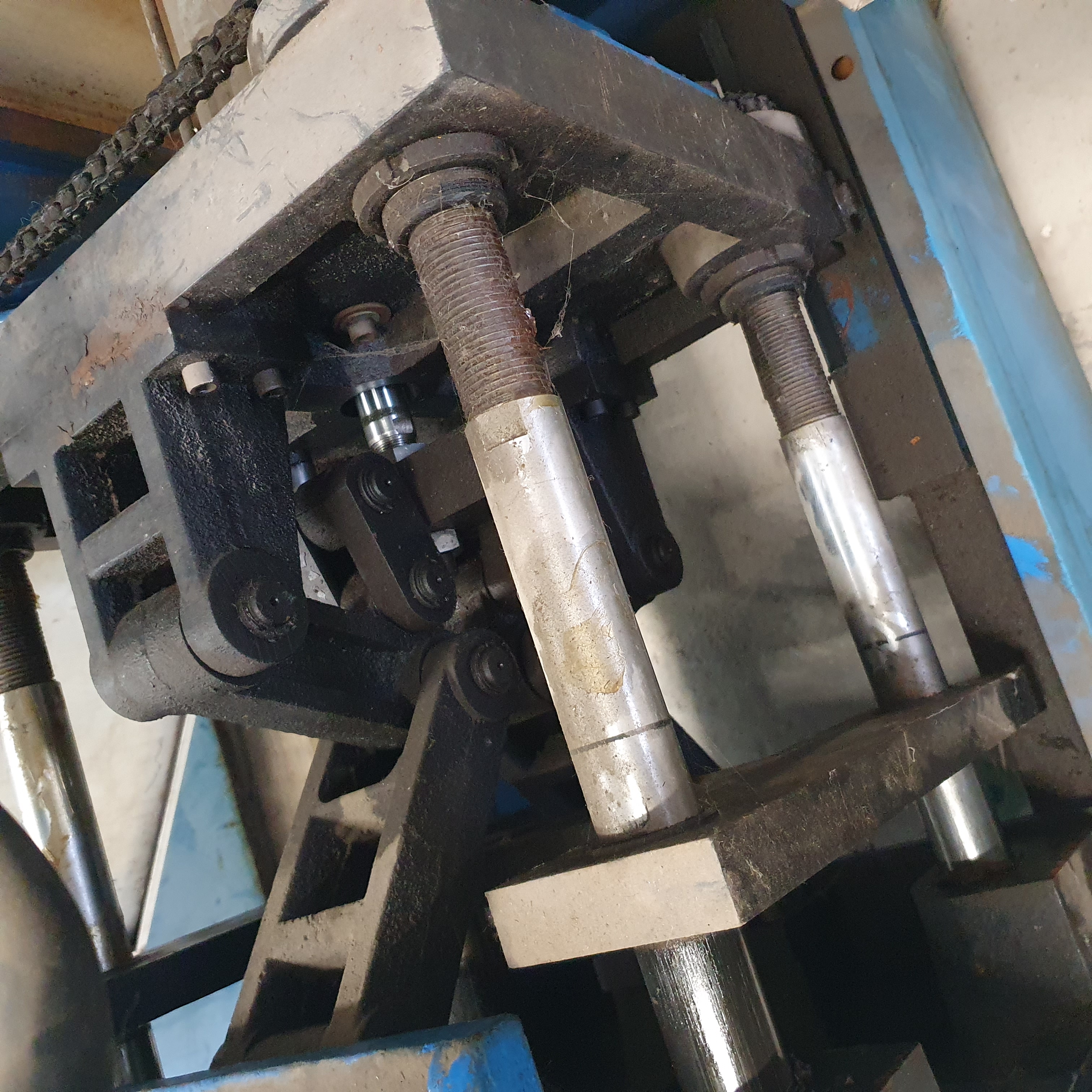 Потом отпускаете гайки на направляющих штангах с внутренней стороны задней плиты чуть больше чем оставшийся зазор между половинами пресс-формы, и с наружной стороны задней плиты при помощи воротка крутите звездочку, которая через цепь равномерно подтягивает гайки на всех штангах.