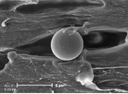 На фото с шариком классическое изображение вакуоли, образующейся при двухосной ориентации пленки. Так делают перламутровый БОПП - блеск образуется из-за этих полостей. Только почему-то форма частицы больше похожа на синтетический SiO2.
