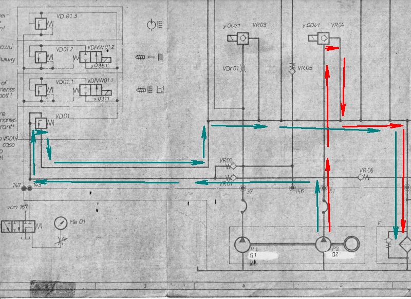 Обратные клапана просто разделяют насосы, чтобы при одном выключенном второй через него не сливался...VR01 VR02 на регулятор давления, а VR05 и VR06 на магистраль цилиндров.