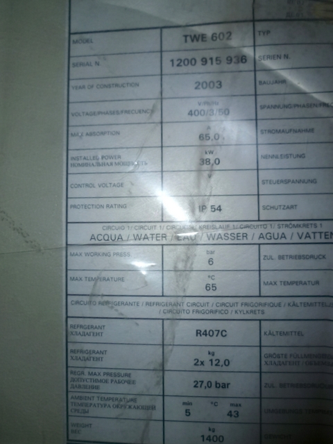Охладитель воды (чиллер) с водяным охлаждением от фирмы General Air Products, Inc. В полной комплектации, измерительной и управляющей аппаратурой, 2-х контурный. Частично работоспособен: один из контуров - в неработающем состоянии (разгерметизация теплообменника). Номинальная мощность 38 kW . Хладагент R407C, допустимое рабочее давление 27 бар. Хранился в сухом отапливаемом помещении. Вес 1400 кг. Производство – 2003 год. Б/У 4 года.