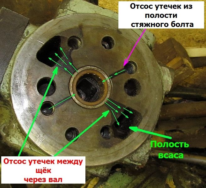 А износ, который Вы отметили, он соеденит полость нагнетания с полостью всаса. На хмельницких насосах при этом давление совсем падает, и я шлифую щёки))), и он снова давит нормально, а сальнику при этом ни чего не угрожает.