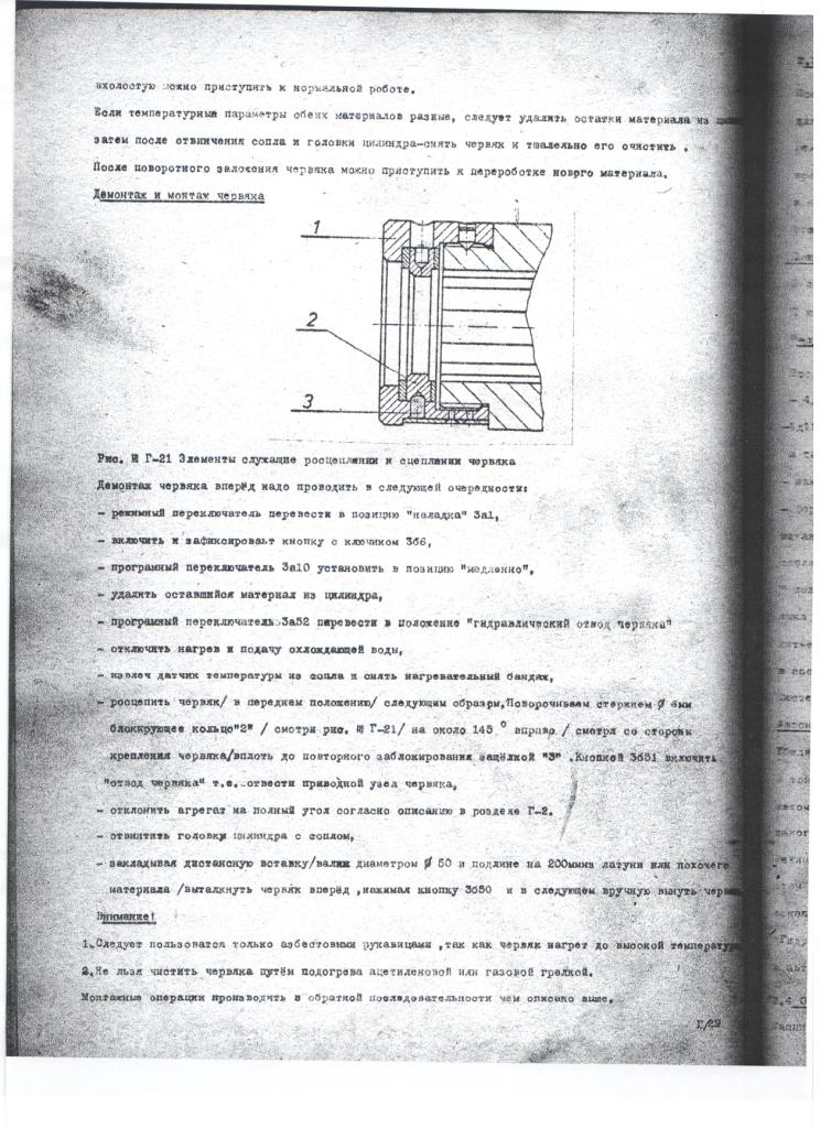 Ни одна книга Вам не даст 100% представления выполнения данной операции. У Вас есть паспорт этого термопласта? Там наверняка есть чертежи в разрезе, или хотя-бы рисунки. Посмотрите. Ну нет ничего сложного в разборке данного узла. Я не знаю как классифицировать данную работу, но не носят же мясорубки в ремонт для помывки или замены ножей. Мы работая с композитными материалами, бывает за смену пару раз шнек вытаскиваем, если кто то нахалтурит с сырьём. Но мы правда тренируемся с Куаси и Сайгером. Так что моё мнение, если располагаете средствами вызывайте ремонтников из специализированой службы, если нет, слесаря пятого разряда, но не по бумажке пятого, а по количеству мозгов. А потом как достанете, аккуратно латуневым зубильцем, как предлагала Наталья Александровна.