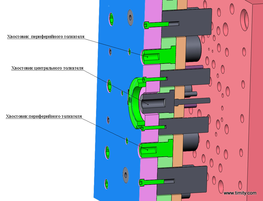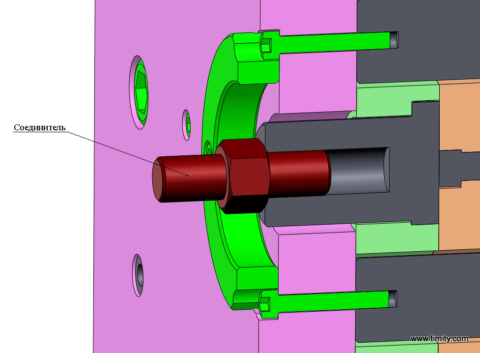 Метод подключения штоков толкателей к толкающей системе пресс-формы должен обеспечивать перпендикулярность движения плит относительно их направляющих колонок. Можно жестко прикрутить только центральный толкатель, а периферийные толкатели оставить неприкрученными, но упирающимися в толкающую систему пресс-формы для обеспечения перпендикулярности хода. Кстати, на таком принципе устроена толкающая система ряда термопластавтоматов: прикручивается только центральный толкатель, а периферийные просто упираются в плиту толкающей системы пресс-формы. Это очень простая, удобная и надёжная схема.