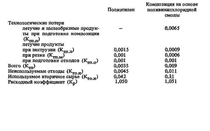 "При планировании производства и проведении балансовых расчетов целесообразно использовать средние нормы расхода и нормативные расходные коэффициенты. Такие коэффициенты и нормативы техноло¬гических потерь и отходов, разработанные с учетом опыта передовых производств, мероприятий по снижению расхода сырья в производстве труб (стабилизация поставок сырья в марочном ассортименте, специализация по типоразмерам выпускаемых труб, использование систем си¬лосного складирования, пневмотранспорта и др.), представлены ниже: В табл. 18 представлены нормы расхода полиэтилена на производство 1000 пог. м напорных труб. Нормы рассчитаны, исходя из 1С = 1,050 Поскольку технологические отходы нельзя использовать для изготовления напорных труб из полиэтилена, то их применяют в производстве других видов продукции (каналов связи, профильно-погонажных изделий, изделий неответственного назначения и т.п.) и учитывают в балансе потребления сырья и материалов. Средняя плотность полиэтилена р = = 0,95 г/см3. При изготовлении напорных труб из полиэтилена другой плотности расчетную норму расхода умножают на коэффициент пере¬счета Кп =ρ/0,95.