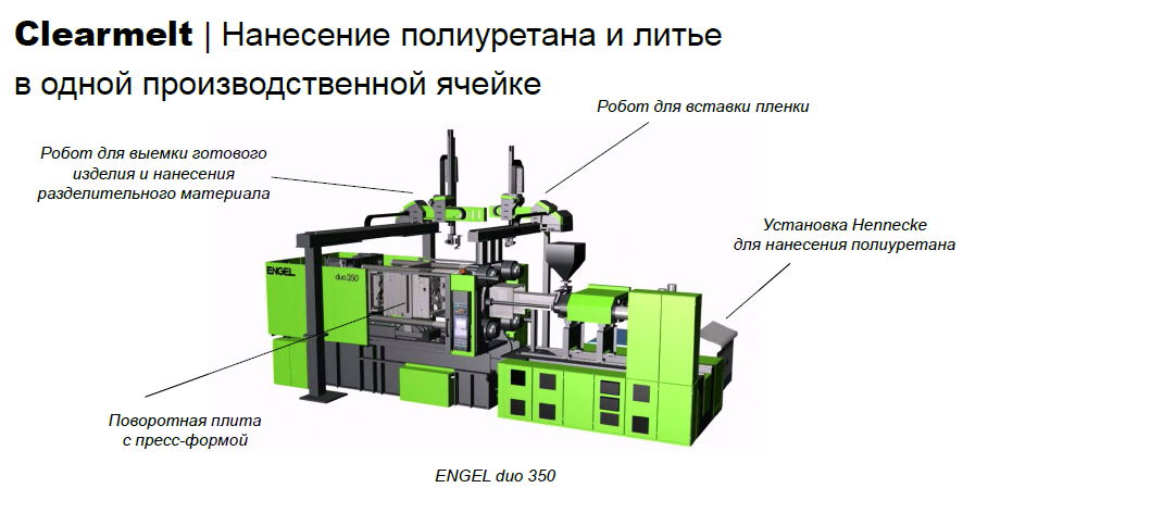 4. Clearmelt (из технологий будущего) – изготовление изделия с высококачественной полиуретановой поверхностью на ТПА, Один цикл – одно изделие (традиционно такие изделия производятся методом многократного нанесения лакокрасочного покрытия).