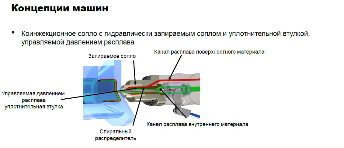 Эта новая технология формования с использованием нескольких материалов убирает препятствия к широкому распространению ко-инжекции, сохраняя при этом все преимущества традиционной инжекции. Простота и экономичность отличают эту инновационную технологию от других технологий ко-инжекции. В рамках этого нового подхода практически любую формовочную машину можно приспособить под многокомпонентное формование.