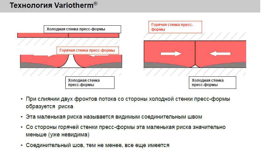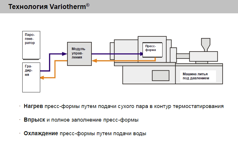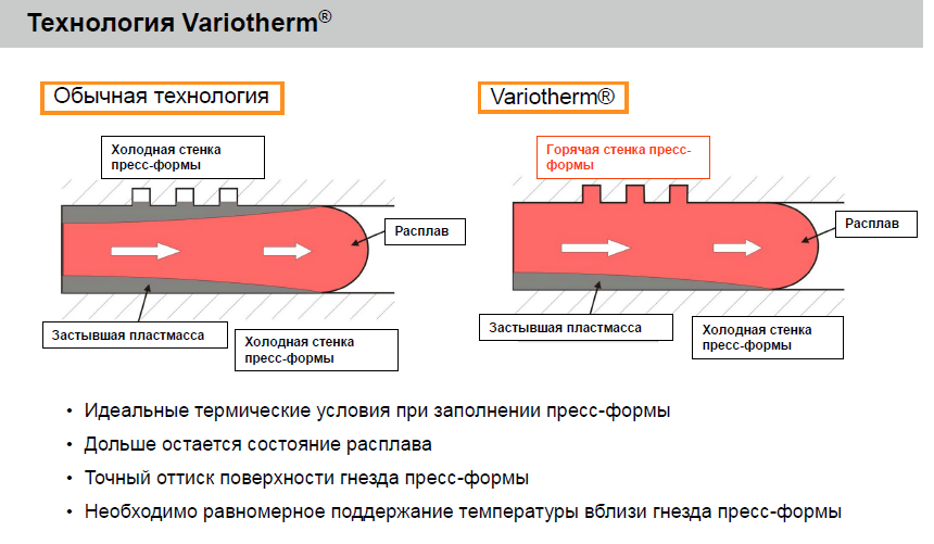 Технология Variotherm –технология охлаждения п\ф при литье тонкостенных изделий для получения высокого качества поверхности и формованием сложной поверхности за счет горячей стенки (и для охлаждения и для нагрева используется один контур). Вопрос из зала: Какое требование к хладагенту?