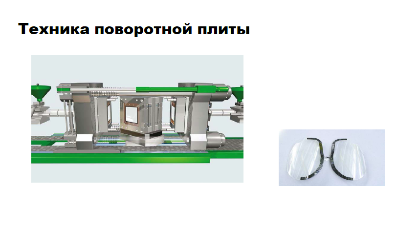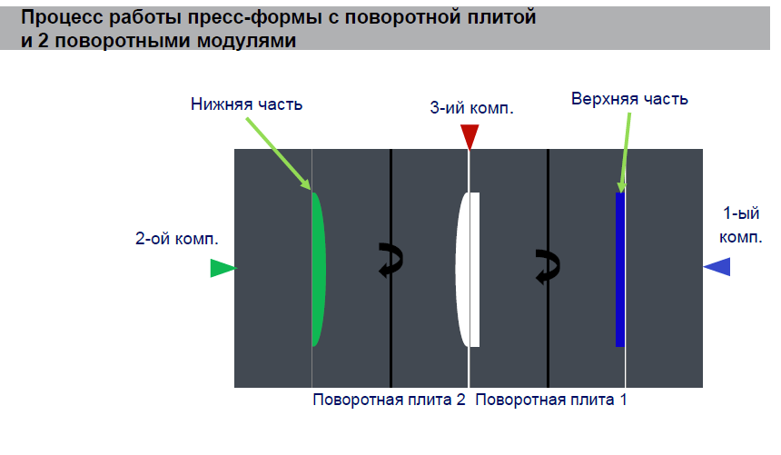 - перестановка изделия в форме с помощью робота - использование поворотного стола - применение шиберов - использование индексного механизма - поворотная плита на горизонтальном поворотном столе Расположение узлов впрыска при combimelt: