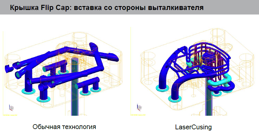 - возможность охлаждения вблизи контура (следовательно, высокое качество, малое время цикла, низкая себестоимость изделия).