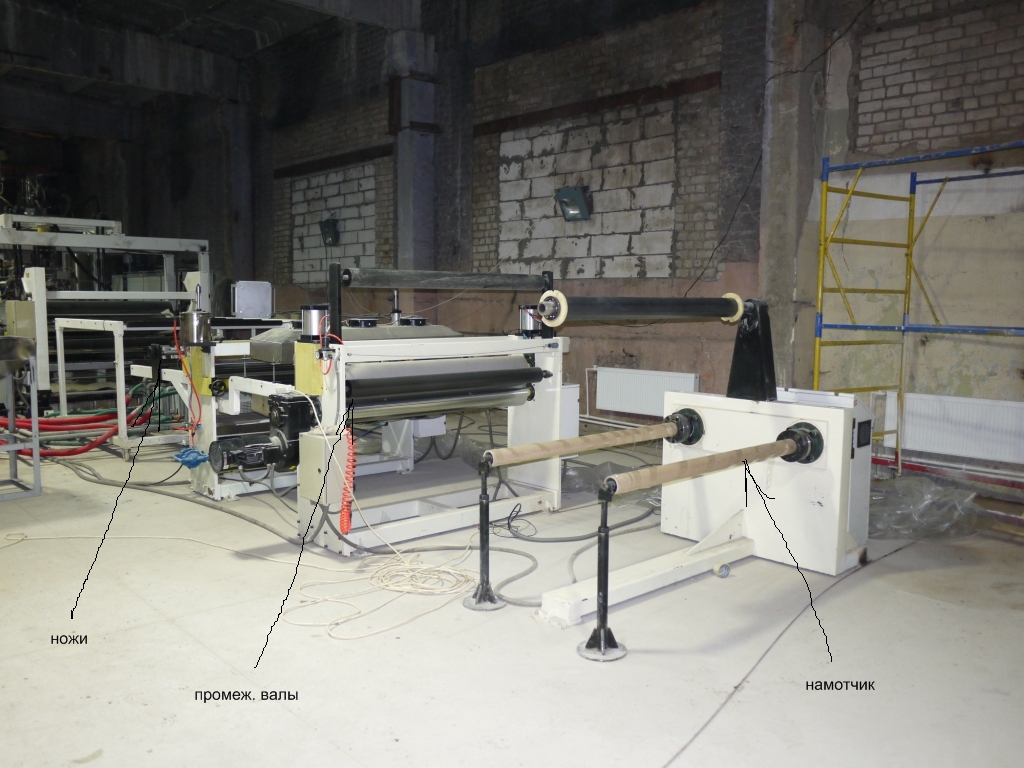 после разрезки пленки ножами операторы похдватывают 4 куска пленки, протягивают их через промежуточные валки, и стараются одновременно намотать их на 4 шпули, находящиеся на одном валу...