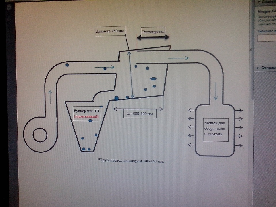 Такую схему я использовал для отделения ПВД пленки от камней, метала и кусков пластика, отличие только у мешка есть силос под пленку. Схема реальная и она работает. Что косается дробилки, если ножи будут рубить а не резать материал то производительность ее снизится за счет материала в роторе, который терясь о друг друга раворошит картон превращая его в "пух".