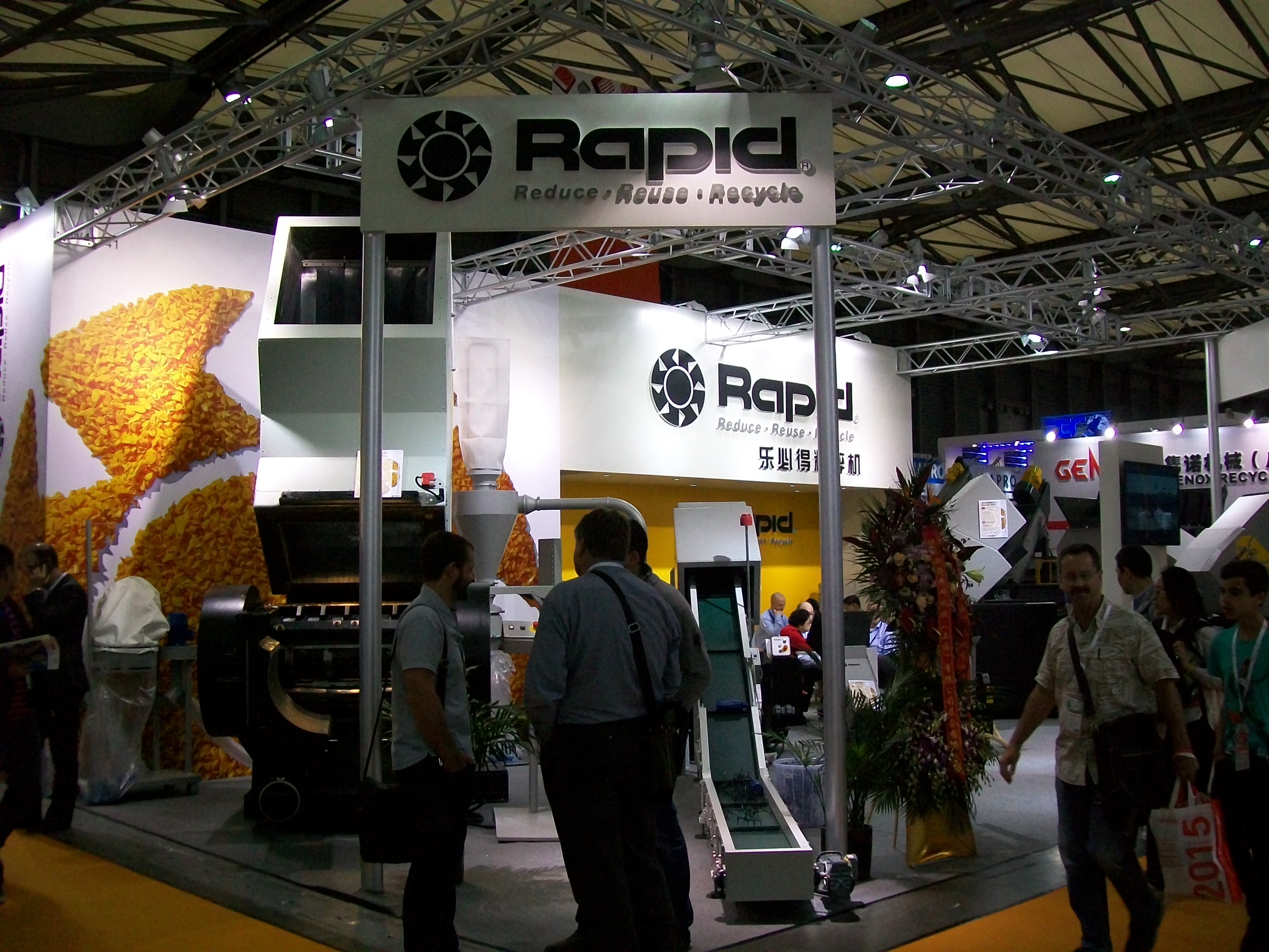 Настоящий бум переживает индустрия рециклинга Китая. Добрый кусок выставки Chinaplas занимали дробилки, шредеры, агломераторы и линии для вторичной переработки разных полимерных изделий. Этот вид оборудования местами занимал целые павильоны, и дышать в таких павильонах было трудно, китайское оборудование работало на славу!