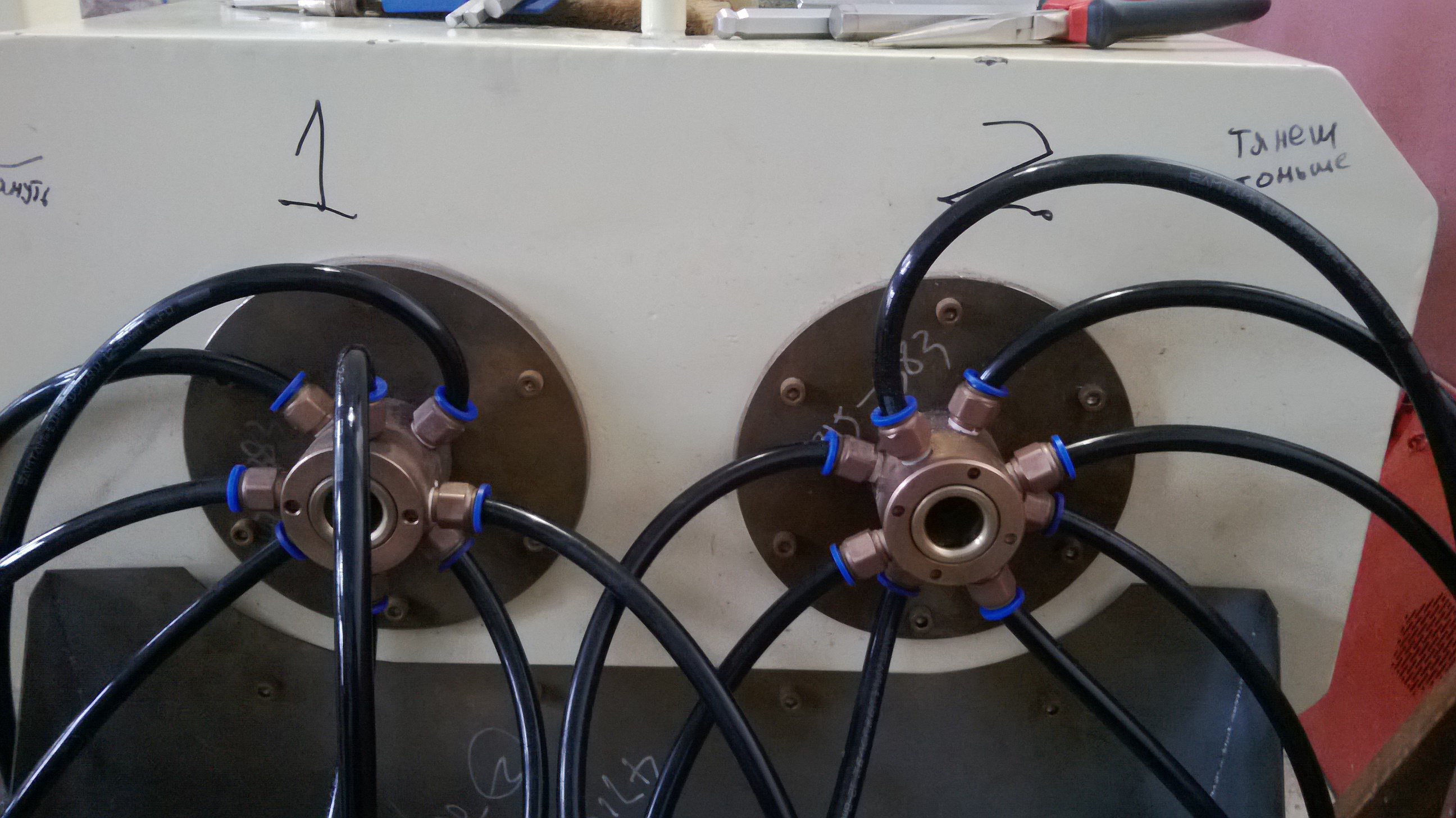 Китайцы "любят" применять пневматические быстросъемы для подачи воды - из-за низкого проходного сечения пневматических быстросъемов количество штуцеров подвода воды на калибр раза в 1,5 - 2 больше чем у европейских калибров.